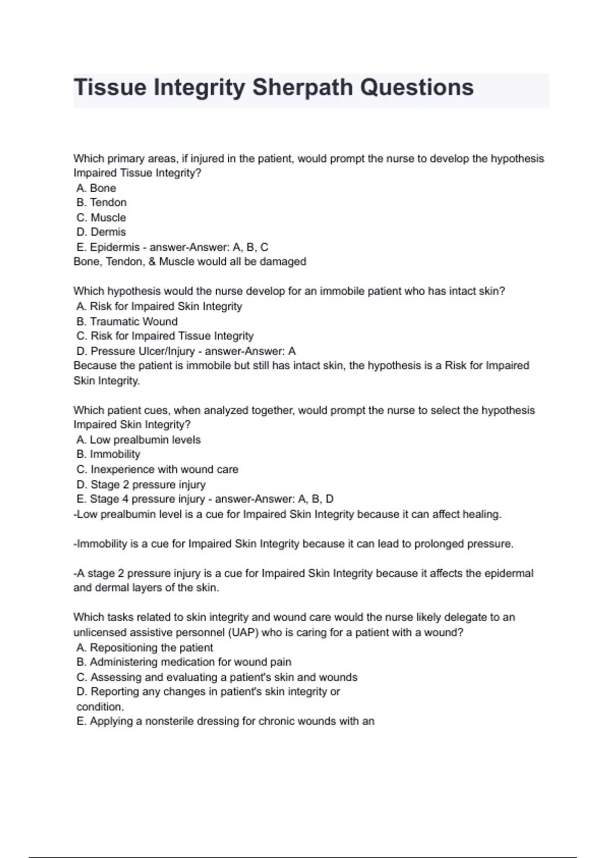 Which primary areas, if injured in the patient, would prompt the nurse to develop the hypothesis Impaired Tissue Integrity? A. Bone B. Tendon C. Muscle D. Dermis E. Epidermis - answer-Answer: A, B, C Bone, Tendon, & Muscle would all be damaged Which hypothesis would the nurse develop for an immobile patient who has intact skin? A. Risk for Impaired Skin Integrity B. Traumatic Wound C. Risk for Impaired Tissue Integrity D. Pressure Ulcer/Injury - answer-Answer: A Because the patient is immobile but still has intact skin, the hypothesis is a Risk for Impaired Skin Integrity. Which patient cues, when analyzed together, would prompt the nurse to select the hypothesis Impaired Skin Integrity? A. Low prealbumin levels B. Immobility C. Inexperience with wound care D. Stage 2 pressure injury E. Stage 4 pressure injury - answer-Answer: A, B, D -Low prealbumin level is a cue for Impaired Skin Integrity because it can affect healing. -Immobility is a cue for Impaired Skin Integrity because it can lead to prolonged pressure. -A stage 2 pressure injury is a cue for Impaired Skin Integrity because it affects the epidermal and dermal layers of the skin. Which tasks related to skin integrity and wound care would the nurse likely delegate to an unlicensed assistive personnel (UAP) who is caring for a patient with a wound? A. Repositioning the patient B. Administering medication for wound pain C. Assessing and evaluating a patient's skin and wounds D. Reporting any changes in p