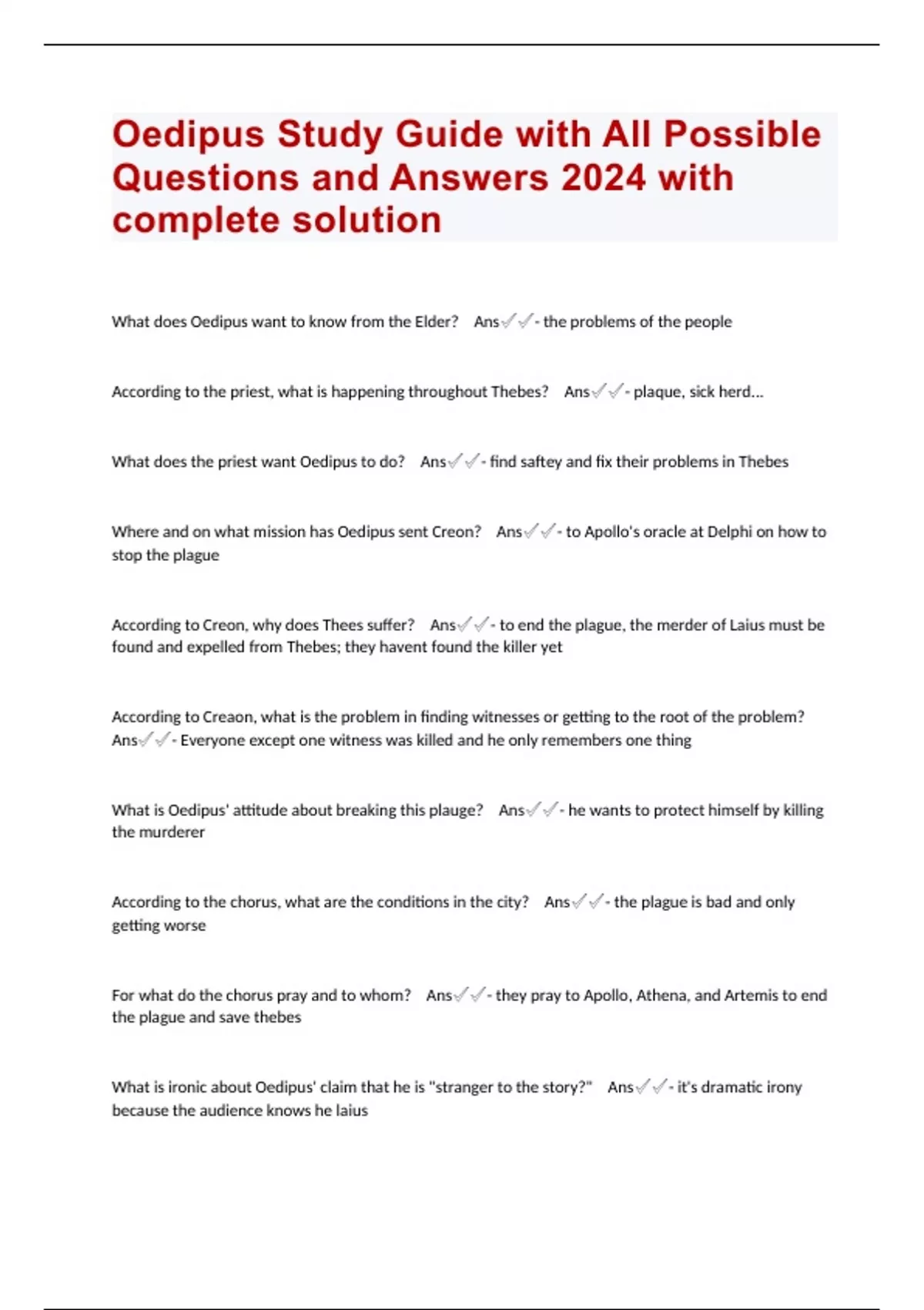 Oedipus Study Guide with All Possible Questions and Answers 2024 with complete solution