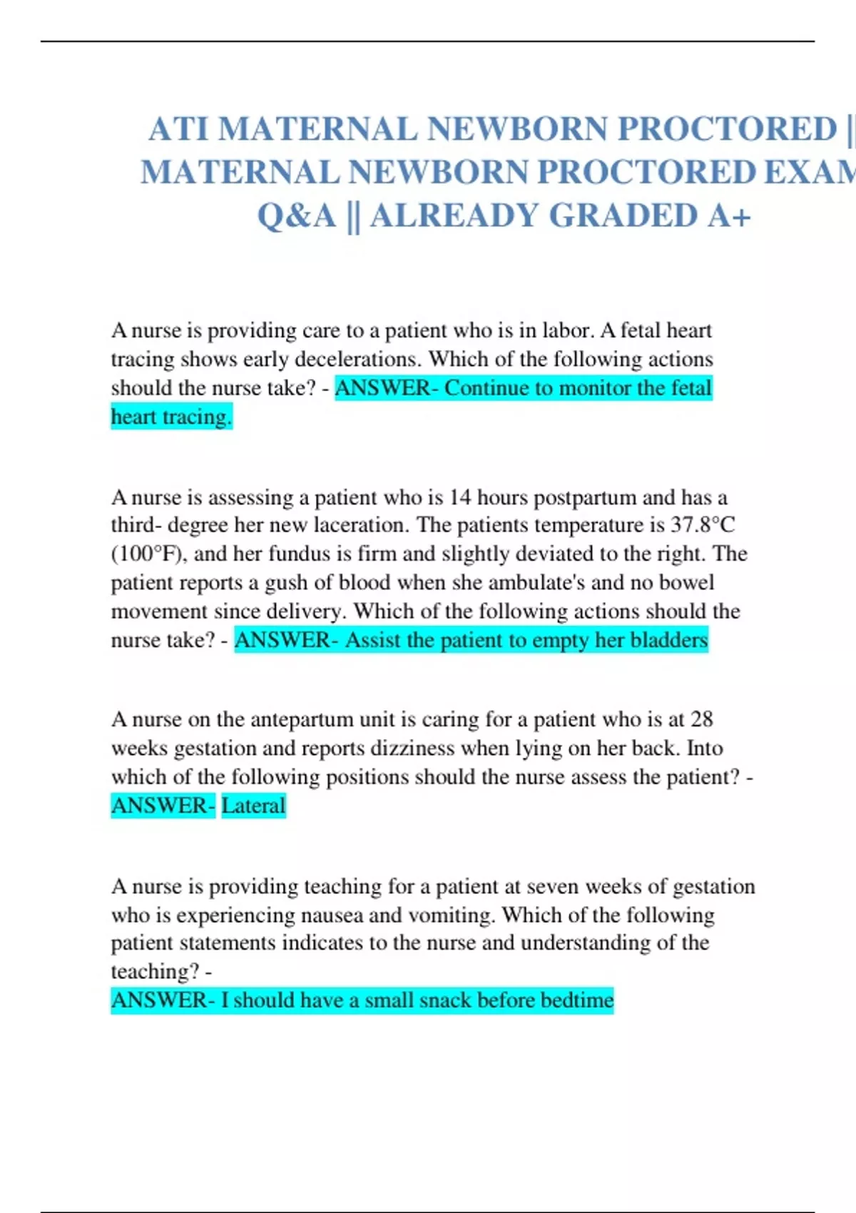 ATI MATERNAL NEWBORN PROCTORED MATERNAL NEWBORN PROCTORED EXAM Q&A ALREADY GRADED A+