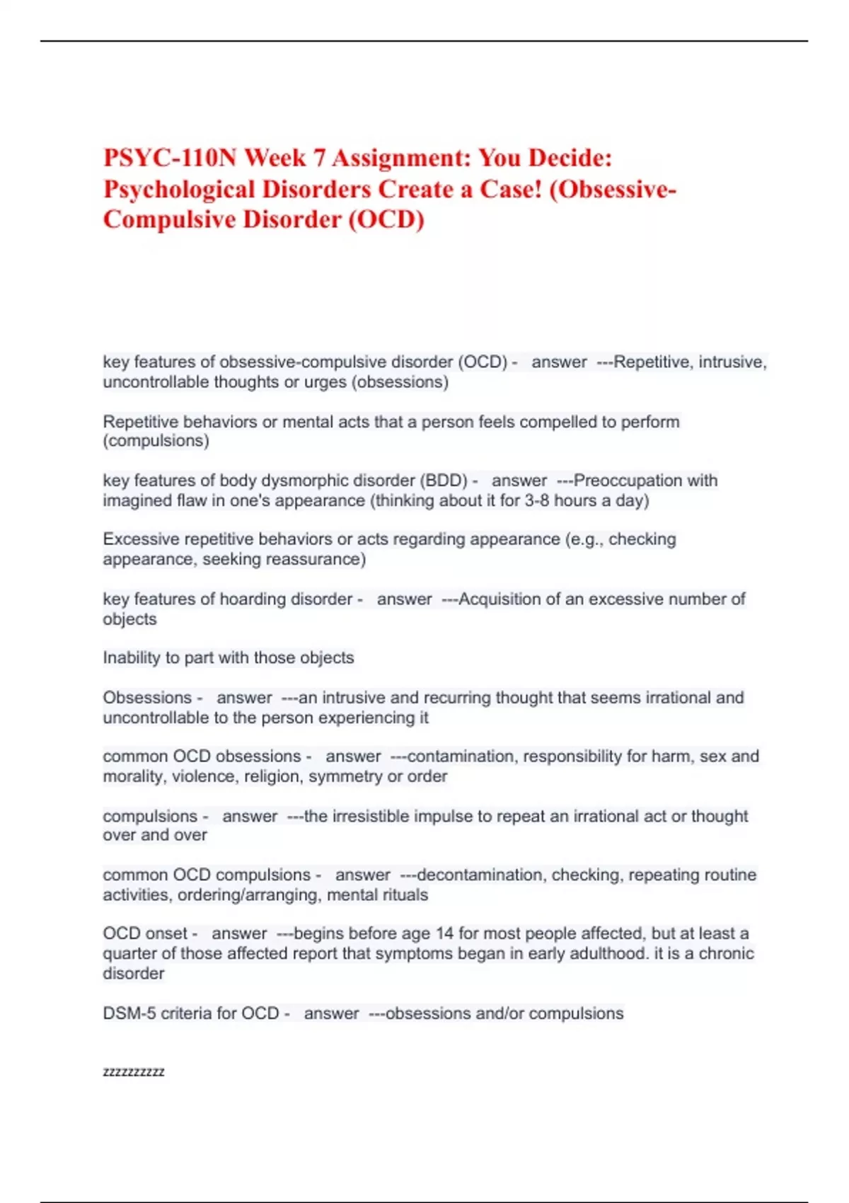 PSYC-110N Week 7 Assignment: You Decide: Psychological Disorders Create a Case! (Obsessive-Compulsive Disorder (OCD)