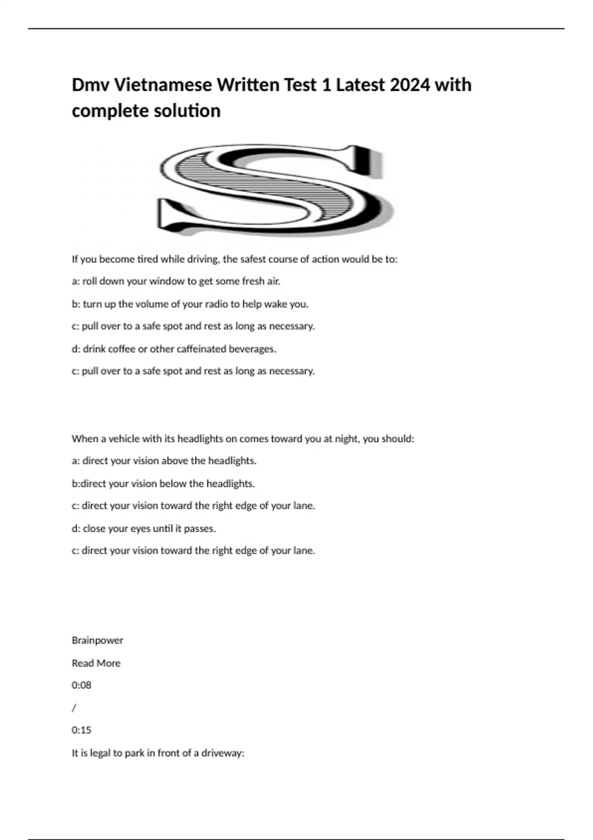 Dmv Vietnamese Written Test 1 Latest 2024 with complete solution If you become tired while driving, the safest course of action would be to: a: roll down your window to get some fresh air. b: turn up the volume of your radio to help wake you. c: pull over to a safe spot and rest as long as necessary. d: drink coffee or other caffeinated beverages. c: pull over to a safe spot and rest as long as necessary.