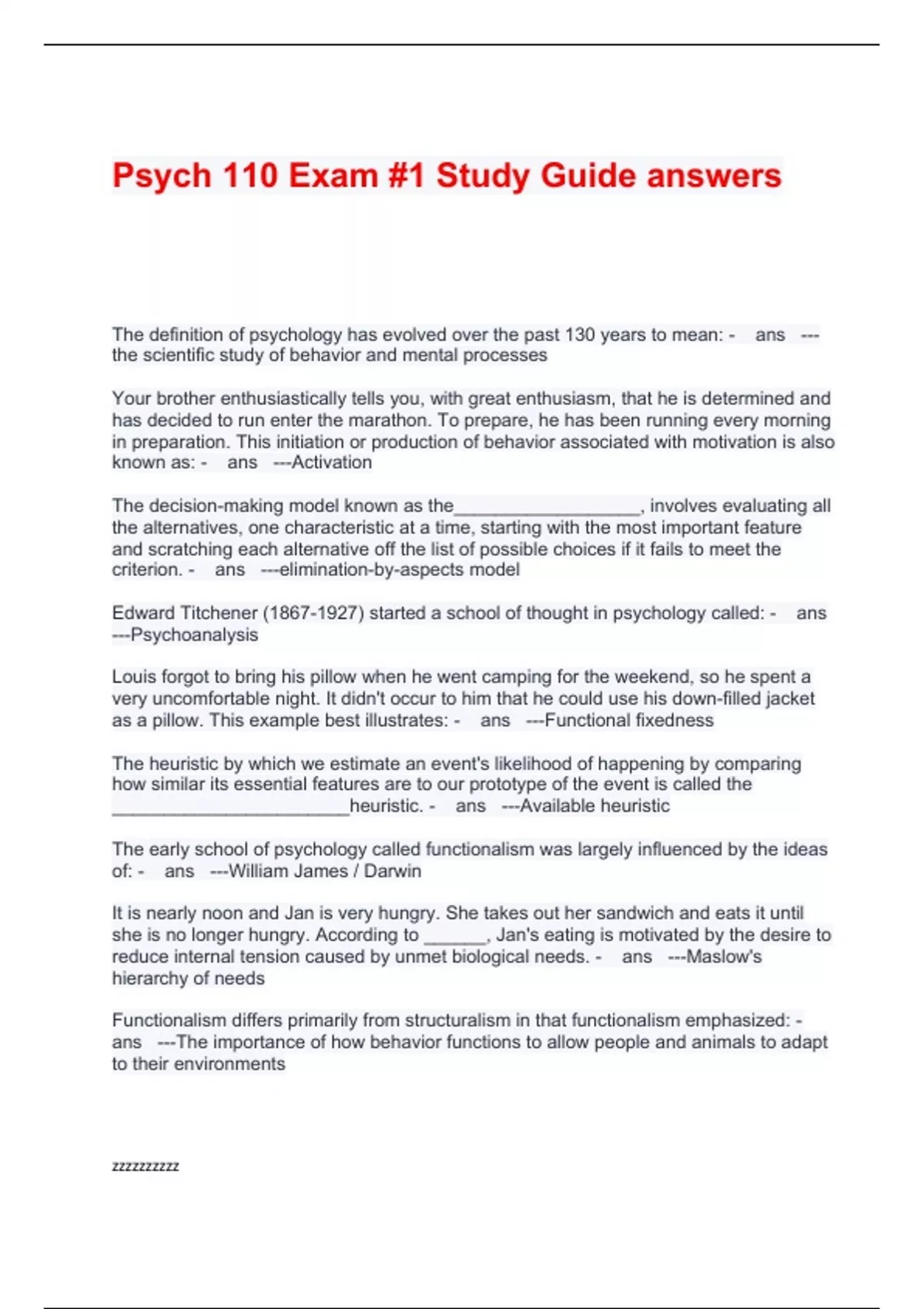 The definition of psychology has evolved over the past 130 years to mean: - ans ---the scientific study of behavior and mental processes Your brother enthusiastically tells you, with great enthusiasm, that he is determined and has decided to run enter the marathon. To prepare, he has been running every morning in preparation. This initiation or production of behavior associated with motivation is also known as: - ans ---Activation The decision-making model known as the__________________, involves evaluating all the alternatives, one characteristic at a time, starting with the most important feature and scratching each alternative off the list of possible choices if it fails to meet the criterion. - ans ---elimination-by-aspects model Edward Titchener () started a school of thought in psychology called: - ans ---Psychoanalysis Louis forgot to bring his pillow when he went camping for the weekend, so he spent a very uncomfortable night. It didn't occur to him that he could use his down-filled jacket as a pillow. This example best illustrates: - ans ---Functional fixedness The heuristic by which we estimate an event's likelihood of happening by comparing how similar its essential features are to our prototype of the event is called the _______________________heuristic. - ans ---Available heuristic The early school of psychology called functionalism was largely influenced by the ideas of: - ans ---William James / Darwin It is nearly noon and Jan is very hungry. She takes out her sandwich and eats it until she is no longer hungry. According to ______, Jan's eating is motivated by the desire to reduce internal tension caused by unmet biological needs. - ans ---Maslow's hierarchy of needs Functionalism differs primarily from structuralism in that functionalism emphasized: - ans ---The importance of how behavior functions to allow people and animals to adapt to their environments