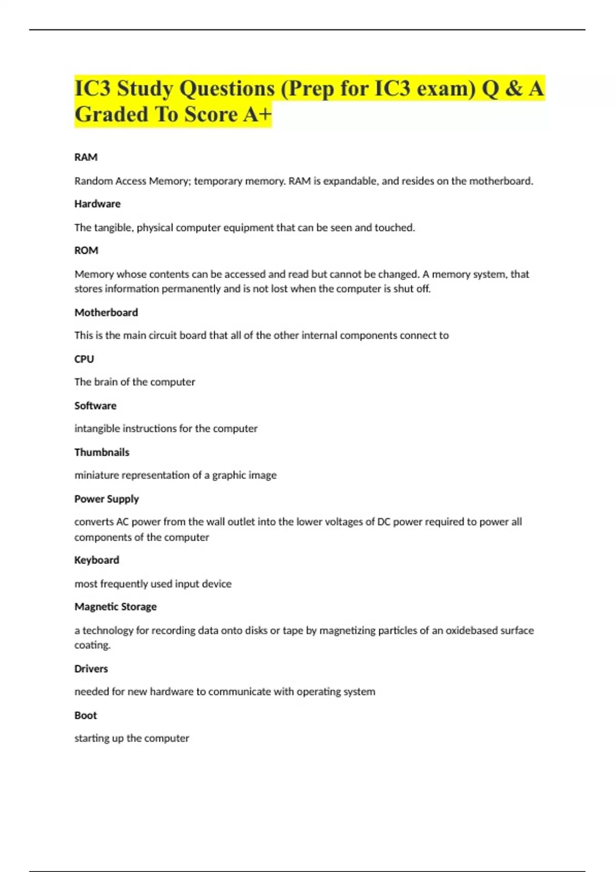 IC3 Study Questions (Prep for IC3 exam) Q & A Graded To Score A+ RAM Random Access Memory; temporary memory. RAM is expandable, and resides on the motherboard. Hardware The tangible, physical computer equipment that can be seen and touched. ROM Memory whose contents can be accessed and read but cannot be changed. A memory system, that stores information permanently and is not lost when the computer is shut off. Motherboard This is the main circuit board that all of the other internal components connect to CPU The brain of the computer Software intangible instructions for the computer Thumbnails miniature representation of a graphic image Power Supply converts AC power from the wall outlet into the lower voltages of DC power required to power all components of the computer Keyboard most frequently used input device Magnetic Storage a technology for recording data onto disks or tape by magnetizing particles of an oxidebased surface coating. Drivers needed for new hardware to communicate with operating system Boot starting up the computer Hertz CPU, RAM, and video card processor speed is measured in this bit the smallest binary unit byte eight bits warranty a manufacturer's ___ determines what the company will do if you discover a flaw in a product. surge when the voltage comes in too high surge suppressor this takes care of excess voltage with surges. uninterruptible power supply provides a battery backup to your compute if the voltage sags or goes out. CRT a computer screen made of glass Recycle Bin the home of deleted files Programmer the name of someone who writes a new application Mainframe a massively powerful computer widely used in the academic, banking, and industrial fields Windows this operating system has the largest market share Linux this operating system uses an open source model of product development and is free Refresh Rate the name of the number of times per second a monitor redraws the image Restocking Fee