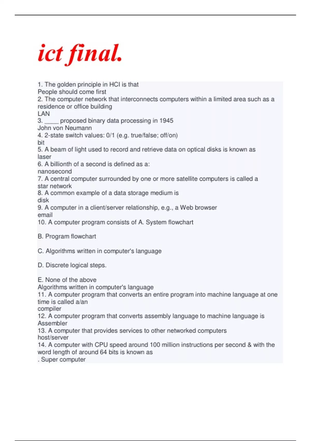 E. None of the above Algorithms written in computer's language 11. A computer program that converts an entire program into machine language at one time is called a/an compiler 12. A computer program that converts assembly language to machine language is Assembler 13. A computer that provides services to other networked computers host/server 14. A computer with CPU speed around 100 million instructions per second & with the word length of around 64 bits is known as . Super computer