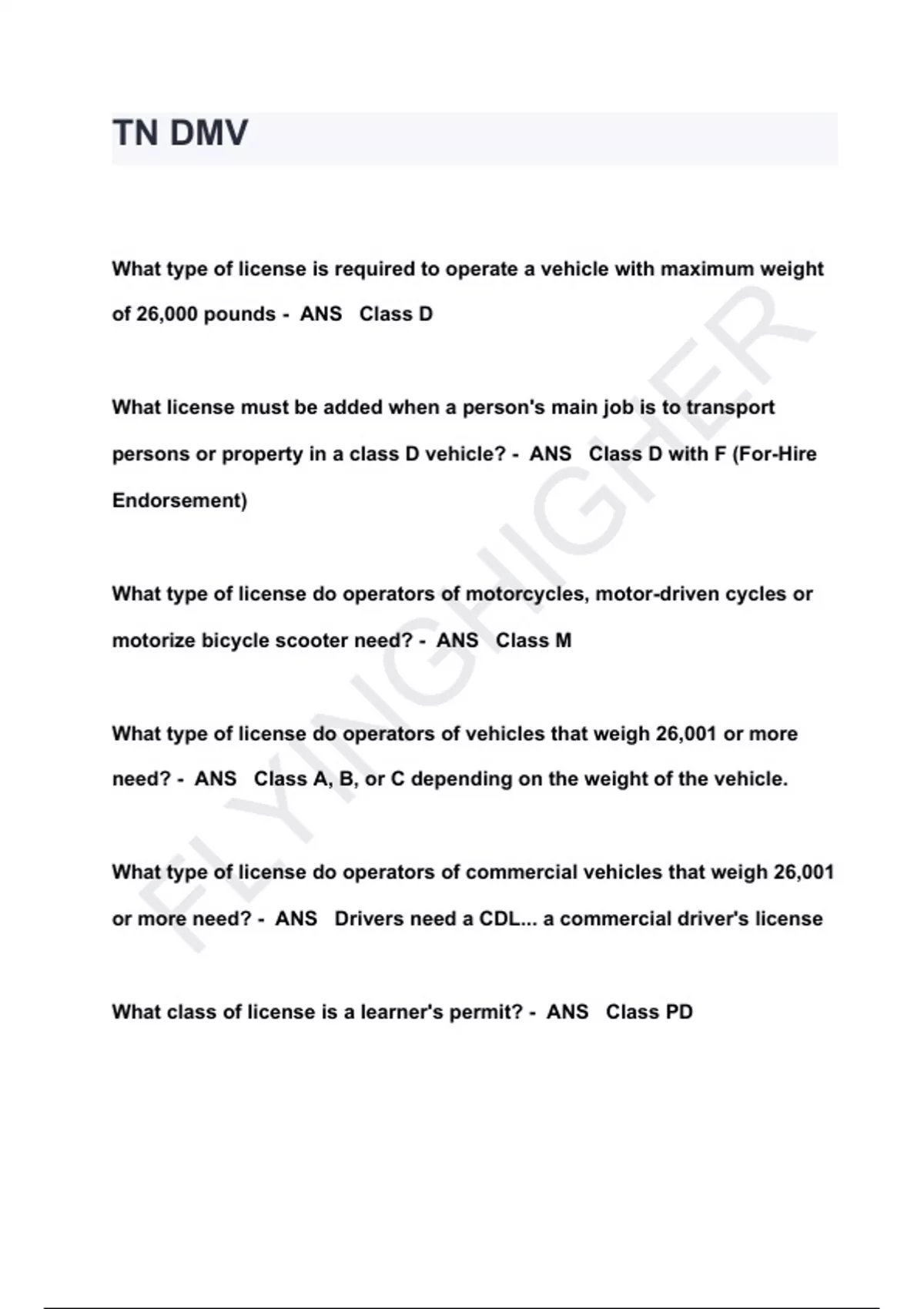 Tennessee F Endorsement Driver's License QUESTIONS & ANSWERS 2024 ( A+ GRADED 100% VERIFIED)
