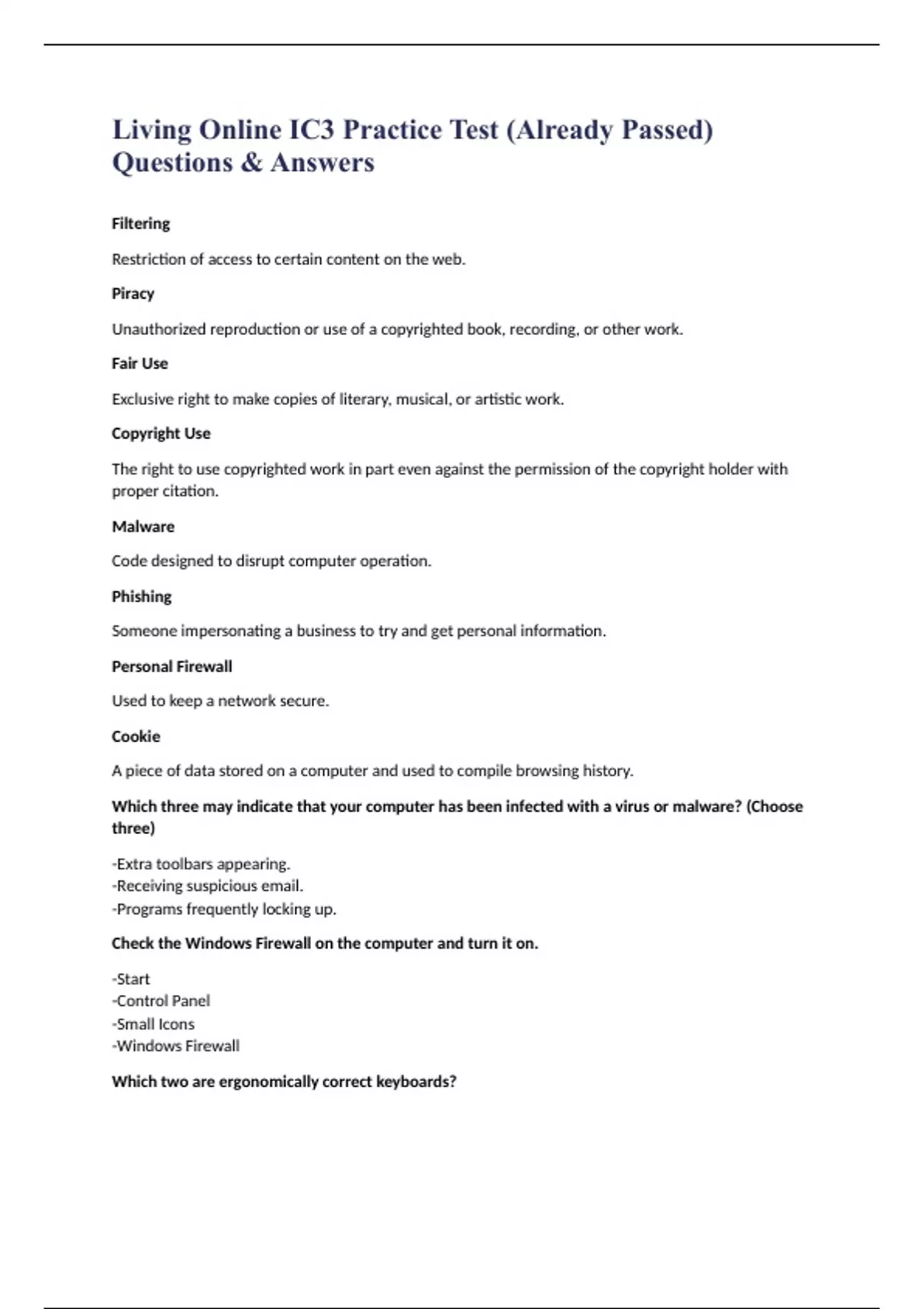 Living Online IC3 Practice Test (Already Passed) Questions & Answers Filtering Restriction of access to certain content on the web. Piracy Unauthorized reproduction or use of a copyrighted book, recording, or other work. Fair Use Exclusive right to make copies of literary, musical, or artistic work. Copyright Use The right to use copyrighted work in part even against the permission of the copyright holder with proper citation. Malware Code designed to disrupt computer operation. Phishing Someone impersonating a business to try and get personal information. Personal Firewall Used to keep a network secure. Cookie A piece of data stored on a computer and used to compile browsing history. Which three may indicate that your computer has been infected with a virus or malware? (Choose three) -Extra toolbars appearing. -Receiving suspicious email. -Programs frequently locking up. Check the Windows Firewall on the computer and turn it on. -Start -Control Panel -Small Icons -Windows Firewall Which two are ergonomically correct keyboards? -Slim USB Keyboard -Split Keyboards What are two ergonomics best practices? -Preventing eye strain -Reducing repetitive motion injuries What is an online discussion site where people can hold conversations in posted messages? Forum Forums Online discussions. Sponsored Links Advertisements purchased by companies. Knowledge Bases Repositories for institutional information. Articles Documents containing information. Which two are correct search operators? - + - AND Perform a Google search to only display Olympic events from the website. You can change the search string or the search options. Olympic events site: Which three tasks can be performed by using Google Search? -Convert currencies. -Perform calculations. -Listen to music via videos. A user wants to know the differences between the 32-bit and 64-bit editions of Windows 7. The user wants to look for information on the M website and have it appear in the first search engine results. What text string should be typed into a search engine to render the correct results? -Windows 7 differences 32 64 bit site:M What will allow the user to hide an email address from other recipients? Bcc What will automatically send a pre-written email to senders of all incoming emails? Out of office Body Main area where message is typed. Contact List Record of user names and email information. Inbox Folder for arriving emails. Subject Line Topic of the message. Attachment Supplementary file added to outgoing message. Which email feature automatically includes pre-written text at the end of all email communications? Signature Which two are true of telepresence? -Supports collaboration -Minimal communication delay What are two real-time communication methods? -Video conference -Instant messaging What is an example of a real-time audio and visual communication between people at different locations? Videoconference Which offers real-time text transmissions between personal computer? Instant messaging Change the browser home page to always start on a blank page. -Tools -Tabs -When a new tab is opened, open: -A blank page Which are two credible Web sources to find information about a valid chemistry study?