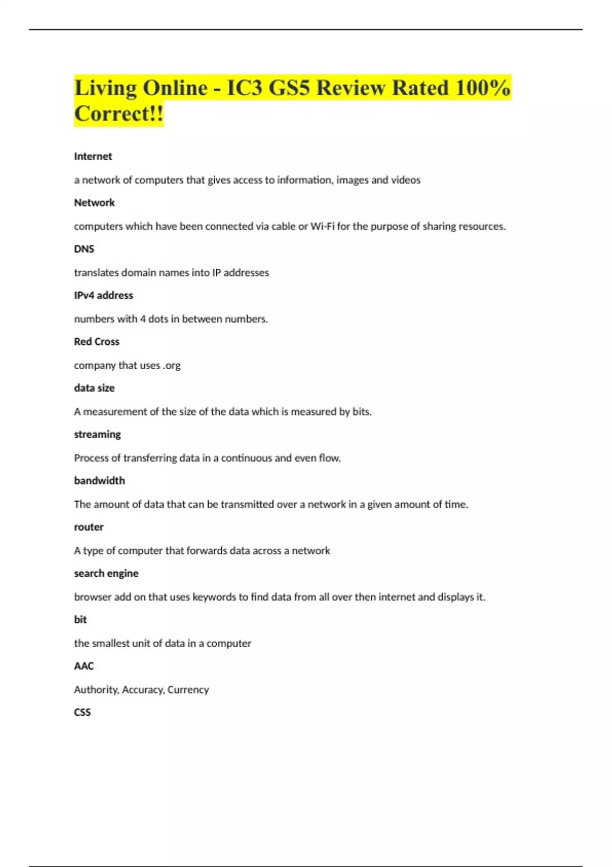 Living Online - IC3 GS5 Review Rated 100% Correct!! Internet a network of computers that gives access to information, images and videos Network computers which have been connected via cable or Wi-Fi for the purpose of sharing resources. DNS translates domain names into IP addresses IPv4 address numbers with 4 dots in between numbers. Red Cross company that uses .org data size A measurement of the size of the data which is measured by bits. streaming Process of transferring data in a continuous and even flow. bandwidth The amount of data that can be transmitted over a network in a given amount of time. router A type of computer that forwards data across a network search engine browser add on that uses keywords to find data from all over then internet and displays it. bit the smallest unit of data in a computer AAC Authority, Accuracy, Currency CSS