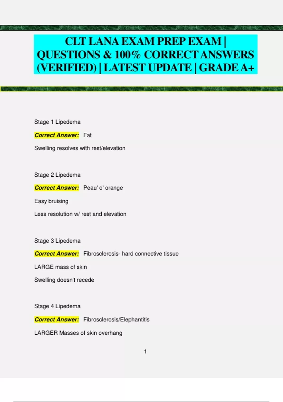 CLT LANA EXAM PREP EXAM | QUESTIONS & 100% CORRECT ANSWERS (VERIFIED) | LATEST UPDATE | GRADEA+ Stage 1 Lipedema Correct Answer: Fat Swelling resolves with rest/elevation Stage 2 Lipedema Correct Answer: Peau' d' orange Easy bruising Less resolution w/ rest and elevation Stage 3 Lipedema Correct Answer: Fibrosclerosis- hard connective tissue LARGE mass of skin Swelling doesn't recede Stage 4 Lipedema Correct Answer: Fibrosclerosis/Elephantitis LARGER Masses of skin overhang 2 LIPO-LYMPHEDEMA (becomes lymphedema at this stage) Columnar pants Correct Answer: column like swelling with lipedema Harem pants (pantaloons) Correct Answer: like princess Jazmine pants in Aladin lipedema jodhpurs (riding breeches) Correct Answer: big hips and smaller calfs lipedema Lymphedema Stage 0 AKA Correct Answer: Subclinical or Latent Stage Lymphedema Stage 0 Characteristics Correct Answer: -No swelling -Reduced TC and functional reserve -Normal tissue consistency but US can reveal changes -May have heaviness, achiness, warmth (Transient symptoms) -Education/prevention Lymphedema Stage 1 AKA Correct Answer: Reversible Stage 3 Lymphedema Stage 1 Characteristics Correct Answer: -Pitting edema that goes down w/ elevation or treatment heavy, aching, fatigued