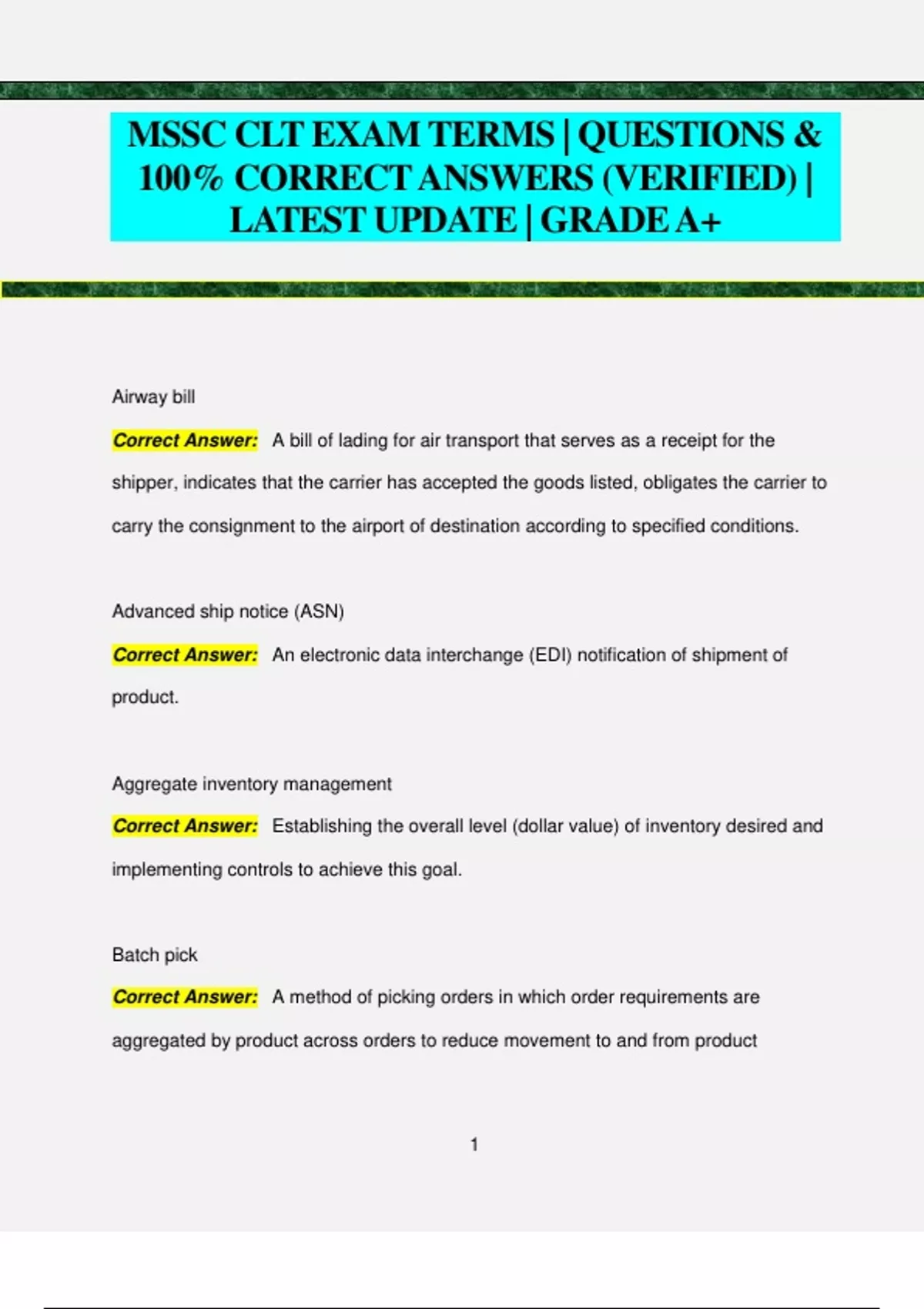 MSSC CLT EXAM TERMS | QUESTIONS & 100% CORRECT ANSWERS (VERIFIED) | LATEST UPDATE | GRADEA+ Airway bill Correct Answer: A bill of lading for air transport that serves as a receipt for the shipper, indicates that the carrier has accepted the goods listed, obligates the carrier to carry the consignment to the airport of destination according to specified conditions. Advanced ship notice (ASN) Correct Answer: An electronic data interchange (EDI) notification of shipment of product. Aggregate inventory management Correct Answer: Establishing the overall level (dollar value) of inventory desired and implementing controls to achieve this goal. Batch pick Correct Answer: A method of picking orders in which order requirements are aggregated by product across orders to reduce movement to and from product 2 locations. The aggregated quantities of each product are then transported to a common area where the individual orders are constructed. Basic Description Correct Answer: Required description on documentation when shipping or handling hazmats. It must include: the Identification Number; Proper Shipping Name; Hazard Class or Division; and Packing Group. Bill of lading Correct Answer: A carrier's contract and receipt for goods the carrier agrees to transport from one place to another and to deliver to a designated person. In case of loss, damage, or delay, the bill of lading is the basis for filing freight claims. Bonding Correct Answer: A system that connects various pieces of conductive equipment together to keep them at the same potential. Static sparking cannot take place between objects that are the same potential. Cantilever rack Correct Answer: A specialized form of rack used for storing long items such as lumber or pipes. Carrier freight bil