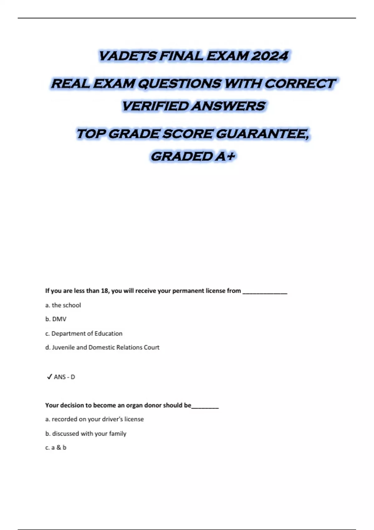 VADETS FINAL EXAM 2024 REAL EXAM QUESTIONS WITH CORRECT VERIFIED ANSWERS TOP GRADE SCORE GUARANTEE, GRADED A+