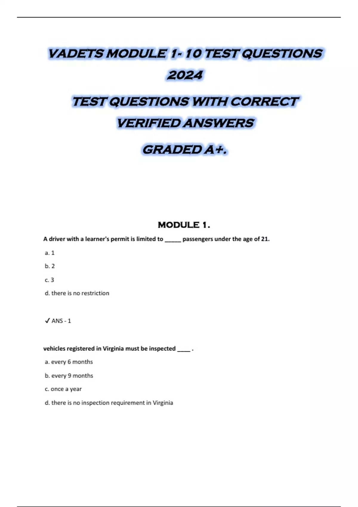 VADETS MODULE 1- 10 TEST QUESTIONS 2024 TEST QUESTIONS WITH CORRECT VERIFIED ANSWERS GRADED A+.