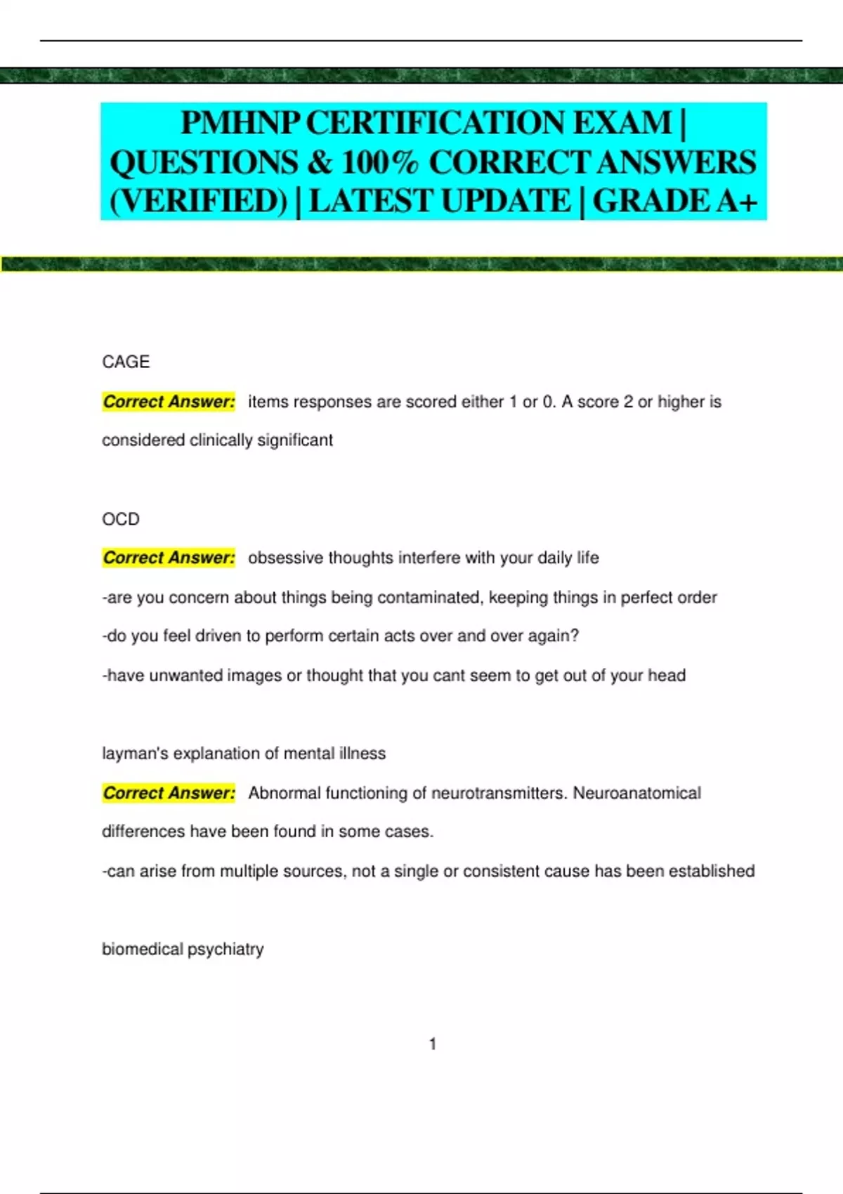 PMHNP CERTIFICATION EXAM | QUESTIONS & 100% CORRECT ANSWERS (VERIFIED) | LATEST UPDATE | GRADEA+ CAGE Correct Answer: items responses are scored either 1 or 0. A score 2 or higher is considered clinically significant OCD Correct Answer: obsessive thoughts interfere with your daily life -are you concern about things being contaminated, keeping things in perfect order -do you feel driven to perform certain acts over and over again? -have unwanted images or thought that you cant seem to get out of your head layman's explanation of mental illness Correct Answer: Abnormal functioning of neurotransmitters. Neuroanatomical differences have been found in some cases. -can arise from multiple sources, not a single or consistent cause has been established biomedical psychiatry 2 Correct Answer: mental illness is conceptualized as a disorder of the brain circuit caused by a complex interplay of genetic and environmental factor state-dependent learning Correct Answer: when a memory is formed a new neural pathway is created. If the memory was formed under specific chemical conditions (on a drug, manic), then the pathway will be primed to work most effectively under these circumstances. -state-dependent learning in bipolar. Bipolar individuals in a depressed episode may not be able to recall details of manic episodes. Corroboration is needed. Assessment tools to screen for cognitive impairment Correct Answer: -folstein mini-mental: perfect score is 30. <24 impairment. If only 9th grade education <17 Abnormal sodium levels Correct Answer: -increased: dehydration, methyldopa, -decreased: SIADH, heart failure, nephrotic syndrome, hepatic disease. Abnormal Potassium levels Correct Answer: Increased: amiloride, spirolactone, lithium, propranolol. Decreased alpha 1 antagonists 3 Correct Answer: -vasodilator and used for hypertension -raynauds -PTSD and GAD -benign prostatic hyperplasia (tamsulosin) -agonism: vasoconstrictor -trazadone and many antipsychotic