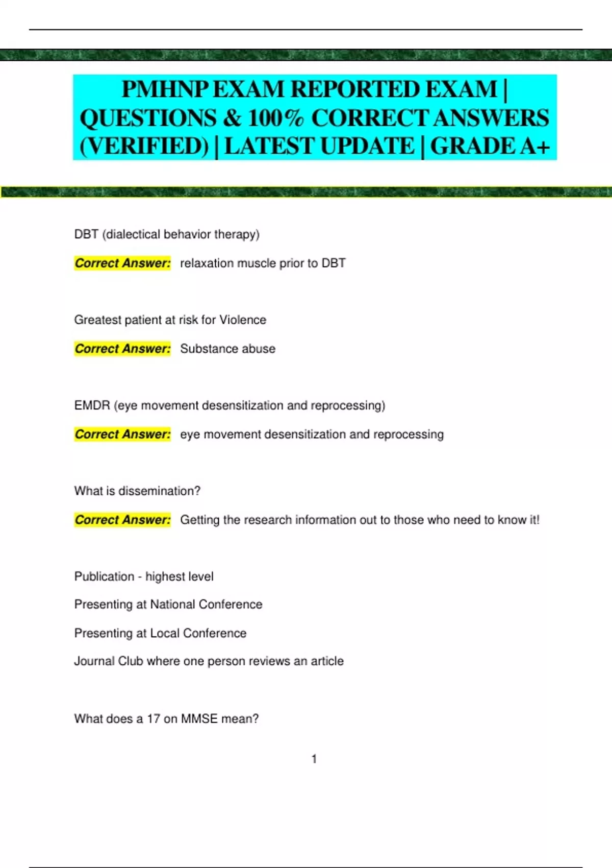 PMHNP EXAM REPORTED EXAM | QUESTIONS & 100% CORRECT ANSWERS (VERIFIED) | LATEST UPDATE | GRADEA+ DBT (dialectical behavior therapy) Correct Answer: relaxation muscle prior to DBT Greatest patient at risk for Violence Correct Answer: Substance abuse EMDR (eye movement desensitization and reprocessing) Correct Answer: eye movement desensitization and reprocessing What is dissemination? Correct Answer: Getting the research information out to those who need to know it! Publication - highest level Presenting at National Conference Presenting at Local Conference Journal Club where one person reviews an article What does a 17 on MMSE mean? 2 Correct Answer: Moderate cognitive impairment What is Tegretol in the CYP450 system? Correct Answer: Inducer -->will lower dose of Lamictal and BCP's What do BCP's do to Lamictal? Correct Answer: Inducer - will lower dose of Lamictal What is a Type I research error? Correct Answer: There IS a difference but you say there isn't a difference. What is a Type II research error? Correct Answer: There is NO difference but you say there is a difference. What is pseudo-dementia? Correct Answer: Cognitive impairment secondary to depression that clears when treated in the elderly. Dementia won't improve. Is it normal for a 1 month old to have a palmar grasp? Correct Answer: Yes. What is a drug 1/2 life? Correct Answer: The time it takes for 50% of a drug to be eliminated from the bod