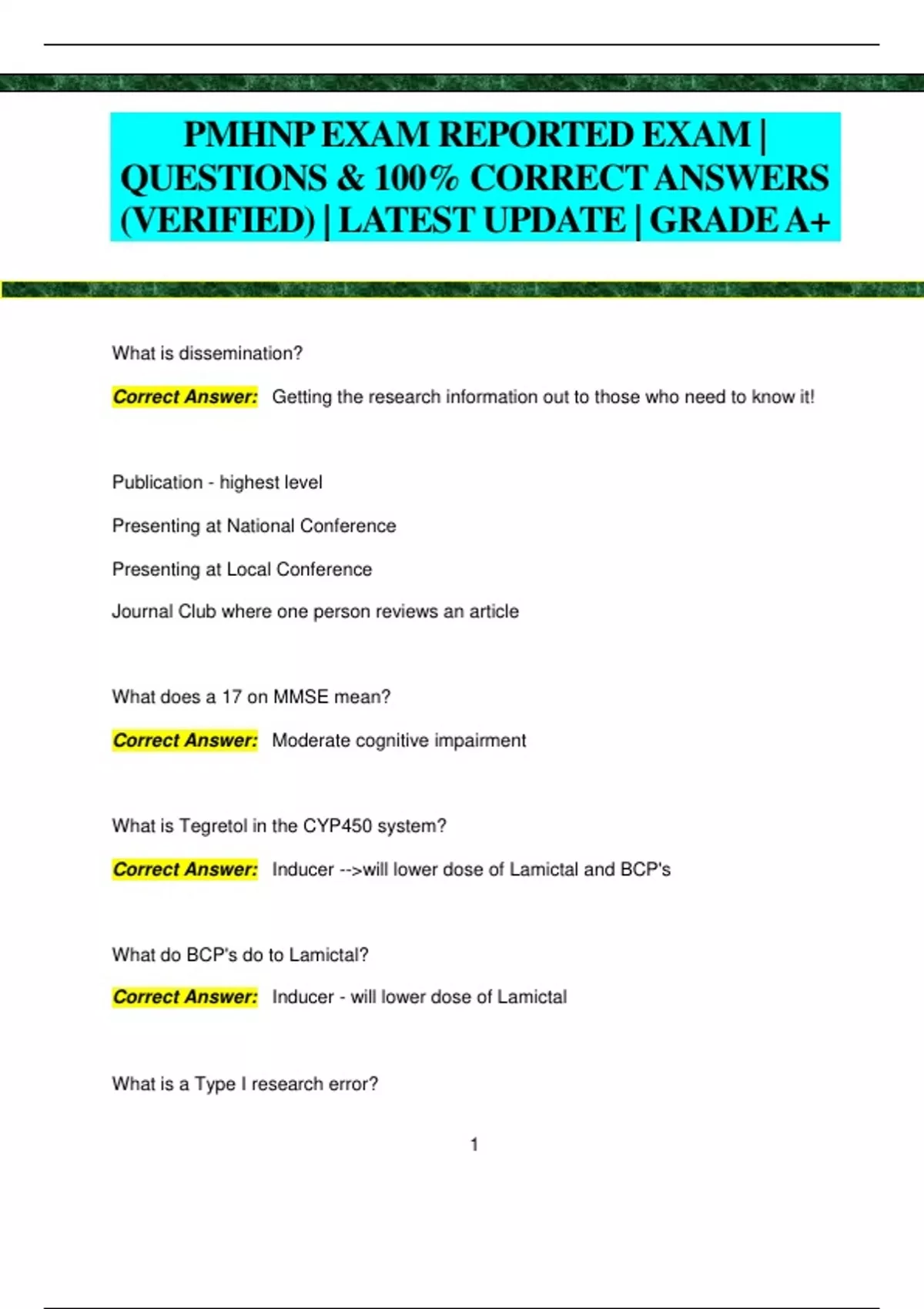 PMHNP EXAM REPORTED EXAM | QUESTIONS & 100% CORRECT ANSWERS (VERIFIED) | LATEST UPDATE | GRADEA+ What is dissemination? Correct Answer: Getting the research information out to those who need to know it! Publication - highest level Presenting at National Conference Presenting at Local Conference Journal Club where one person reviews an article What does a 17 on MMSE mean? Correct Answer: Moderate cognitive impairment What is Tegretol in the CYP450 system? Correct Answer: Inducer -->will lower dose of Lamictal and BCP's What do BCP's do to Lamictal? Correct Answer: Inducer - will lower dose of Lamictal What is a Type I research error? 2 Correct Answer: There IS a difference but you say there isn't a difference. What is a Type II research error? Correct Answer: There is NO difference but you say there is a difference. What is pseudo-dementia? Correct Answer: Cognitive impairment secondary to depression that clears when treated in the elderly. Dementia won't improve. Is it normal for a 1 month old to have a palmar grasp? Correct Answer: Yes. What is a drug 1/2 life? Correct Answer: The time it takes for 50% of a drug to be eliminated from the body. What 3 atypicals can be used with teens? Correct Answer: Zyprexa, Abilify, Seroquel - low doses What is a risk of using Tramadol? Correct Answer: Serotonin Syndrome as it is very serotonergic. What is the allele seen in Asians that increase the risk of SJS? Correct Answer: HLAB-1502 3 When might you see toxic epidermal necrolysis? Correct Answer: With worsening of SJ