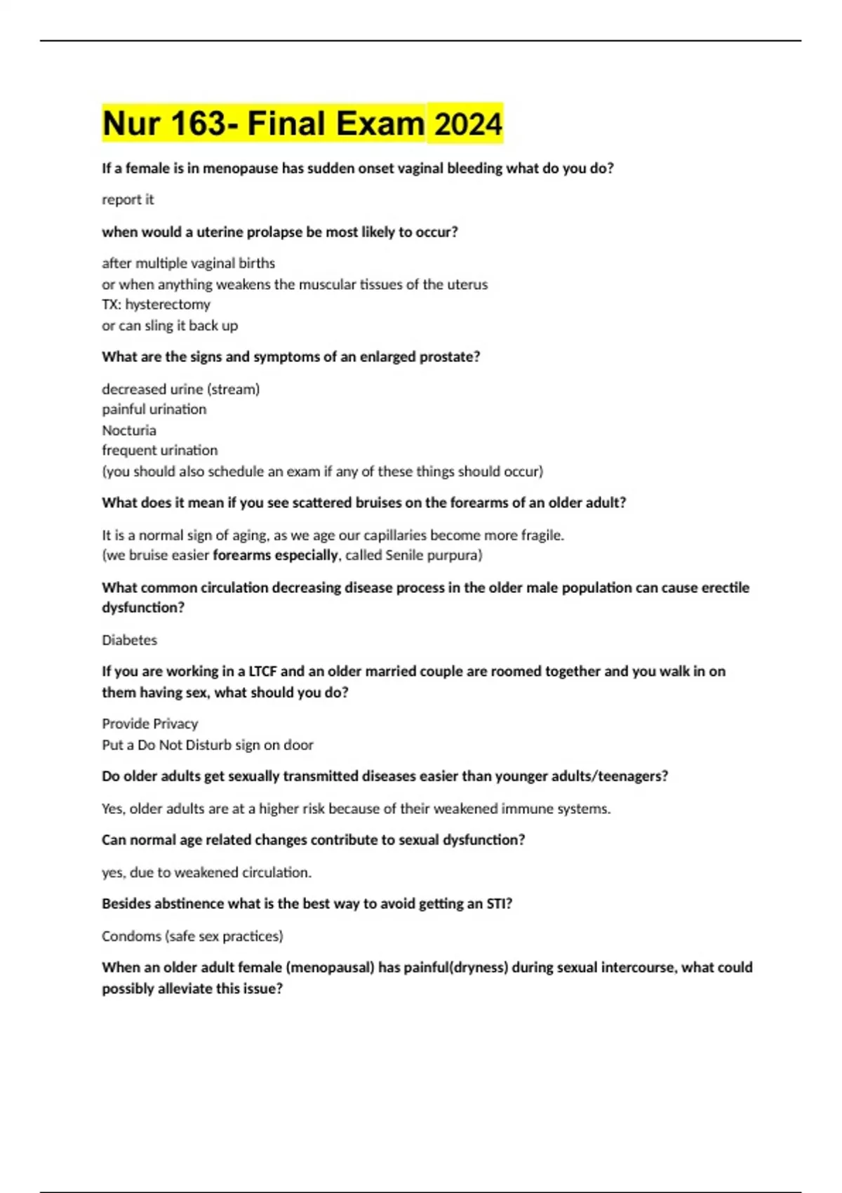 Nur 163- Final Exam 2024 If a female is in menopause has sudden onset vaginal bleeding what do you do? report it when would a uterine prolapse be most likely to occur? after multiple vaginal births or when anything weakens the muscular tissues of the uterus TX: hysterectomy or can sling it back up What are the signs and symptoms of an enlarged prostate? decreased urine (stream) painful urination Nocturia frequent urination (you should also schedule an exam if any of these things should occur) What does it mean if you see scattered bruises on the forearms of an older adult? It is a normal sign of aging, as we age our capillaries become more fragile. (we bruise easier forearms especially, called Senile purpura) What common circulation decreasing disease process in the older male population can cause erectile dysfunction? Diabetes If you are working in a LTCF and an older married couple are roomed together and you walk in on them having sex, what should you do? Provide Privacy Put a Do Not Disturb sign on door Do older adults get sexually transmitted diseases easier than younger adults/teenagers? Yes, older adults are at a higher risk because of their weakened immune systems. Can normal age related changes contribute to sexual dysfunction? yes, due to weakened circulation. Besides abstinence what is the best way to avoid getting an STI? Condoms (safe sex practices) When an older adult female (menopausal) has painful(dryness) during sexual intercourse, what could possibly alleviate this issue? water soluble lubricant Pain medications 30 minutes prior to sexual experience Why do older adults procrastinate going to the doctor? Fear No motivation Transportation Financially unstable What would you question if an older adult is not adhering to a medication or TX regimen? Ask them why? Are they in denial? Can you afford your tx? Do you need transportation? Do you understand why you need these TX? What type of questioning would you use in the heat of a emergency situation? Direct questioning (for rapid-blunt responses) Why shouldn't you use medical jargon when speaking to a client/resident or patient? Not everyone is understanding of medical jargon, could be a communication barrier. If someone is not making eye contact, should you form the preconceived notion that they are not listening? No, in some cultures eye contact is considered offensive, it is imperative that nurses are culturally sensitive and that we do not judge others. If a patient has been waiting for a long period of time for a procedure to take place (EX: XRAY) what can you do to help them? you could call down to x-ray to see what the hold up is and see when they will be available for this patient? This is advocating for this patient. What is evidence of good self image? good hygiene socialization (going to gatherings) What are the feelings/concept associated with ageism? helplessness elders are handicapped elders are unproductive What are the S/S of ineffective coping? using drugs/alcohol to cope isolation sexual promiscuity What could revision of a will mean or be a sign of for an elderly individual? This could be a sign of depression that could be advancing towards signs of possible suicide. What are the normal integumentary changes with age? skin appears clear pale thinner senile purpura (common but not present in everyone) What musculoskeletal exercise is good for distribution of calcium and phosphorus? weight bearing exercises What are risk factors for Osteoporosis? Hip fracture Low estrogen Post-Menopausal Pathological Fractures Smoking Small body frame Gender (more prevalent in women) Sedentary lifestyle Do the elderly have a decrease in fluid throughout the body? Indeed What is subjective data? Subjective data is not observable (Ex: pain, nausea) What is Objective data? Objective data is observable (Ex: BP, foul odor, purulent drainage, swelling) What is on a health history? Allergies Illnesses Surgeries Immunizations Results of physical exams and tests Health habits such as diets and exercise