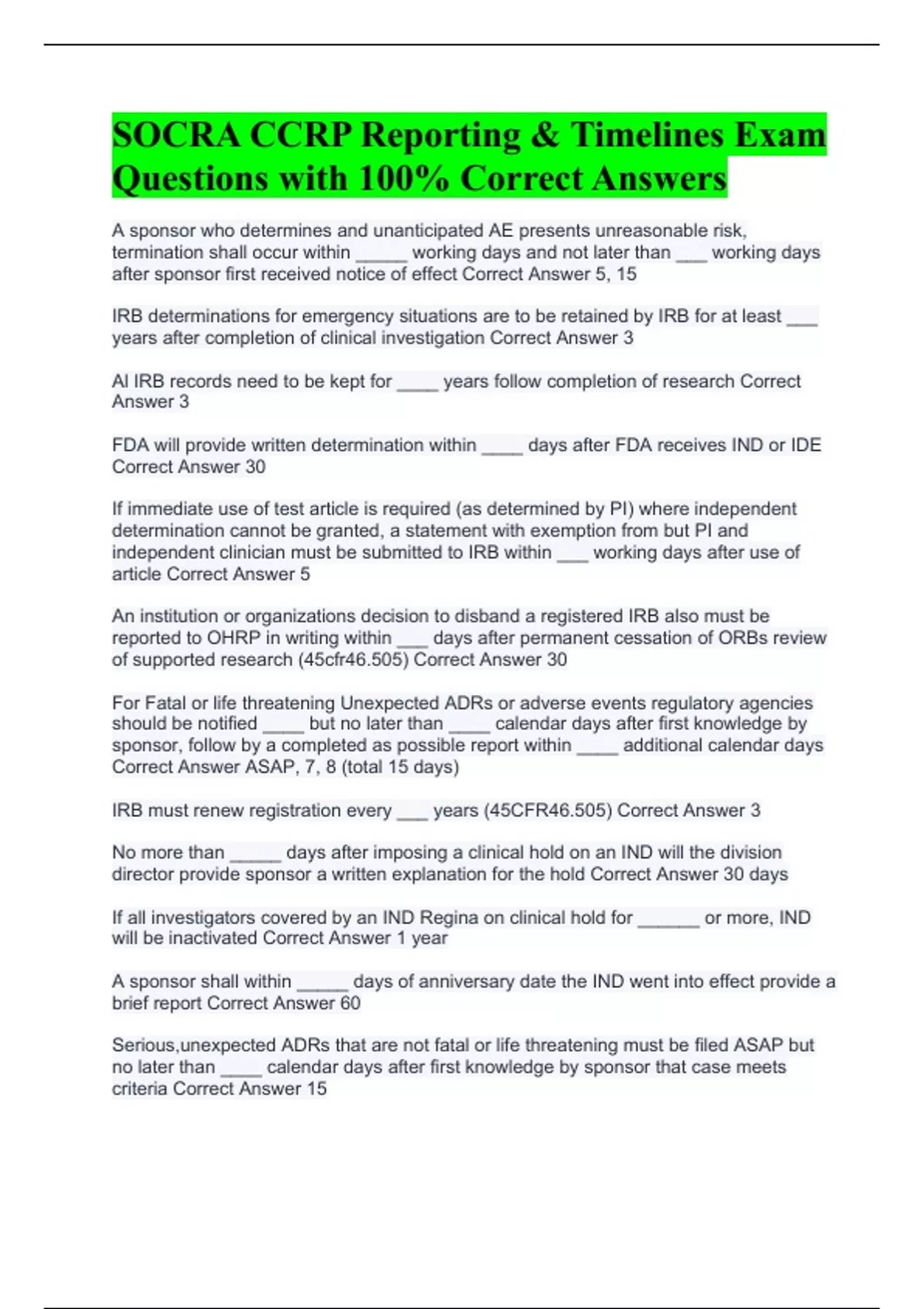 SOCRA CCRP Reporting & Timelines Exam Questions with 100% Correct Answers