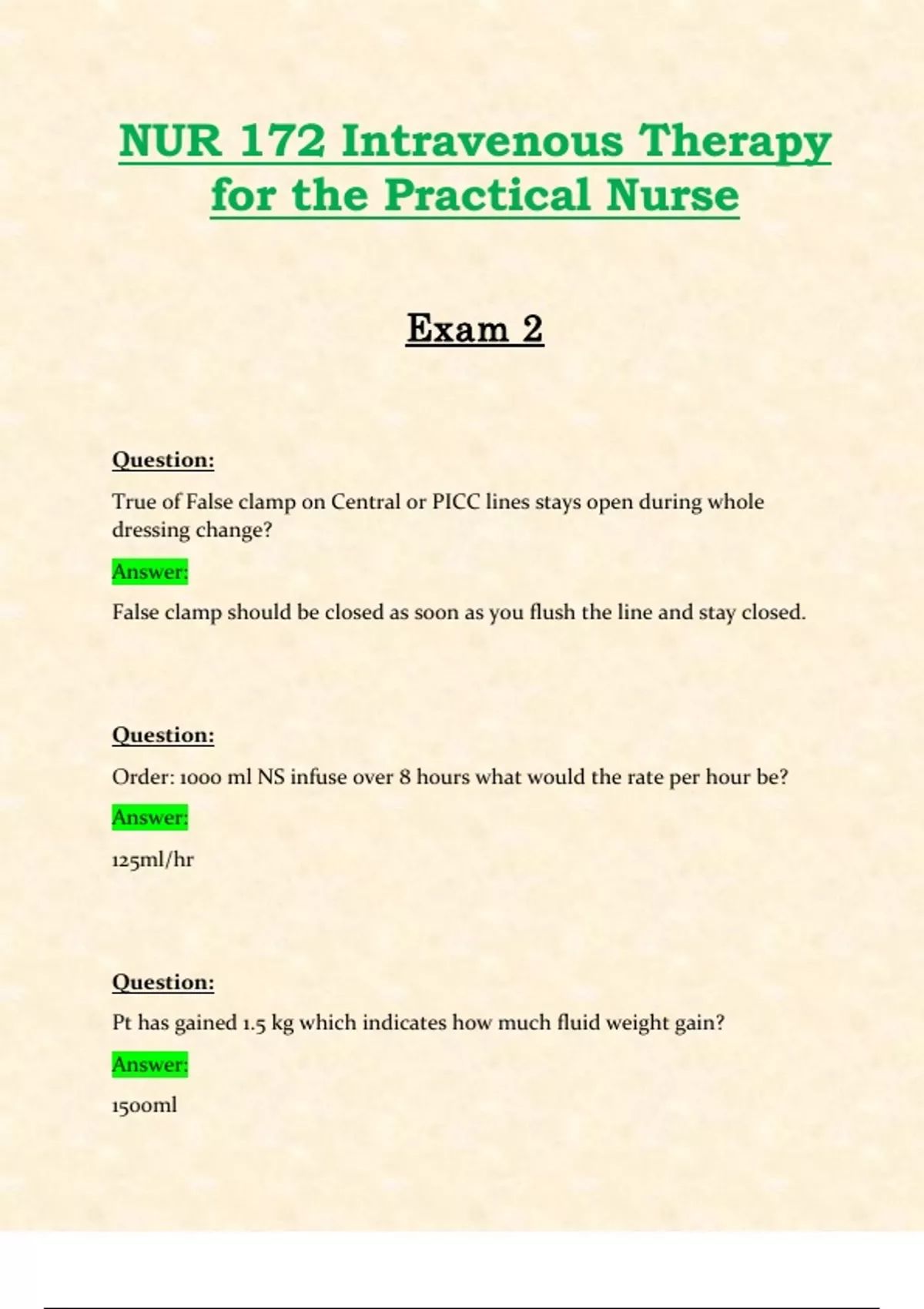 NUR172 / NUR 172 Exam 2 (Latest 2024 / 2025): Intravenous Therapy for the Practical Nurse | Questions and Verified Answers | Already Graded A - Hondros