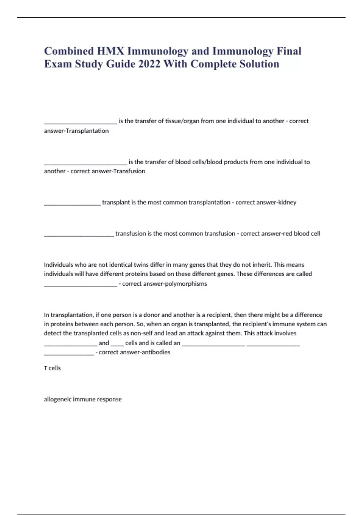 Combined HMX Immunology and Immunology Final Exam Study Guide 2022 With Complete Solution