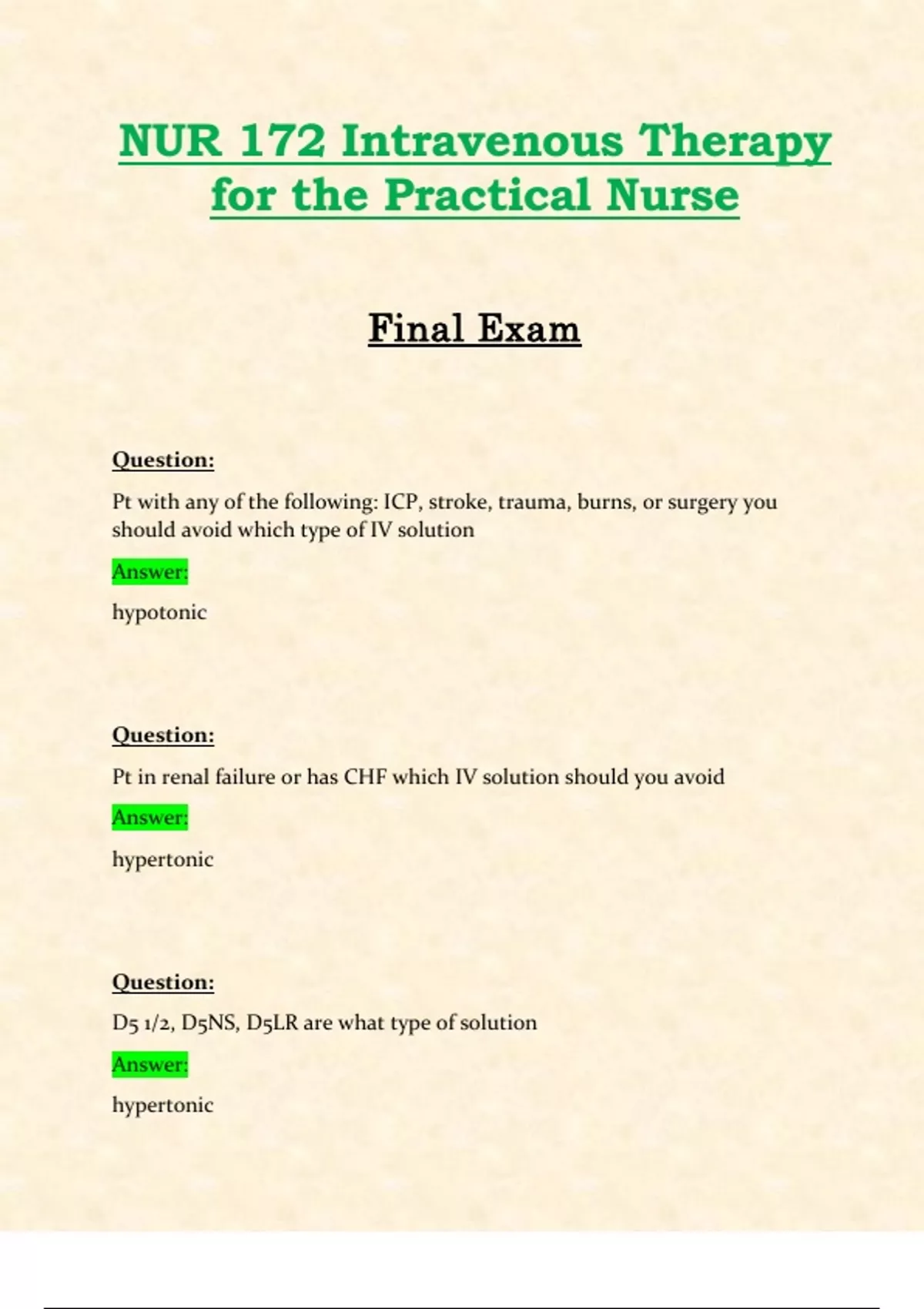 NUR172 / NUR 172 Final Exam (Latest 2024 / 2025): Intravenous Therapy for the Practical Nurse | Questions and Verified Answers | Already Graded A - Hondros