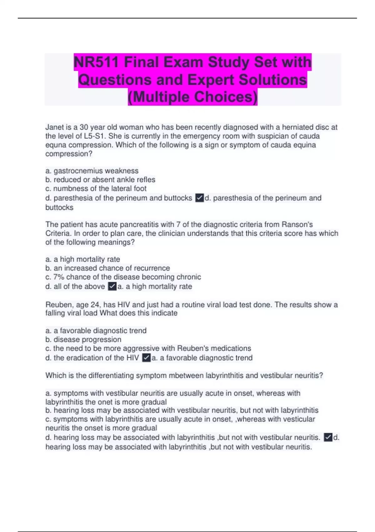 Janet is a 30 year old woman who has been recently diagnosed with a herniated disc at the level of L5-S1. She is currently in the emergency room with suspician of cauda equna compression. Which of the following is a sign or symptom of cauda equina compression? a. gastrocnemius weakness b. reduced or absent ankle refles c. numbness of the lateral foot d. paresthesia of the perineum and buttocks d. paresthesia of the perineum and buttocks The patient has acute pancreatitis with 7 of the diagnostic criteria from Ranson's Criteria. In order to plan care, the clinician understands that this criteria score has which of the following meanings? a. a high mortality rate b. an increased chance of recurrence c. 7% chance of the disease becoming chronic d. all of the above a. a high mortality rate Reuben, age 24, has HIV and just had a routine viral load test done. The results show a falling viral load What does this indicate a. a favorable diagnostic trend b. disease progression c. the need to be more aggressive with Reuben's medications d. the eradication of the HIV a. a favorable diagnostic trend Which is the differentiating symptom mbetween labyrinthitis and vestibular neuritis? a. symptoms with vestibular neuritis are usually acute in onset, whereas with labyrinthitis the onet is more gradual b. hearing loss may be associated with vestibular neuritis, but not with labyrinthitis c. symptoms with labyrinthitis are usually acute in onset, ,whereas with vesticular neuritis the onset is more gradual d. hearing loss may be associated with labyrinthitis ,but not with vestibular neuritis. d. hearing loss may be associated with labyrinthitis ,but not with vestibular neuritis