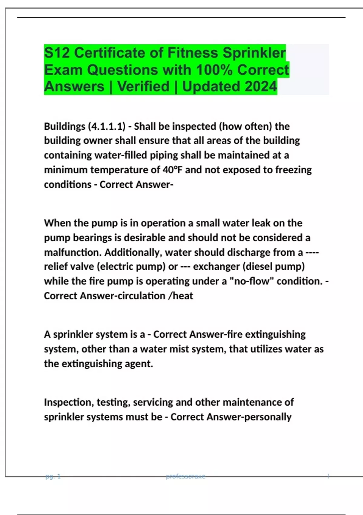 S12 Certificate of Fitness Sprinkler Exam Questions with 100% Correct Answers | Verified | Updated 2024
