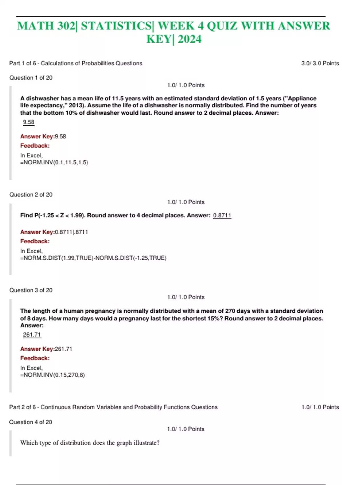 MATH 302| STATISTICS| WEEK 4 QUIZ WITH ANSWER KEY| 2024 Part 1 of 6 - Calculations of Probabilities Questions 3.0/ 3.0 Points Question 1 of 20 1.0/ 1.0 Points A dishwasher has a mean life of 11.5 years with an estimated standard deviation of 1.5 years ("Appliance life expectancy," 2013). Assume the life of a dishwasher is normally distributed. Find the number of years that the bottom 10% of dishwasher would last. Round answer to 2 decimal places. Answer: 9.58 Answer Key:9.58 Feedback: In Excel, =NORM.INV(0.1,11.5,1.5)
