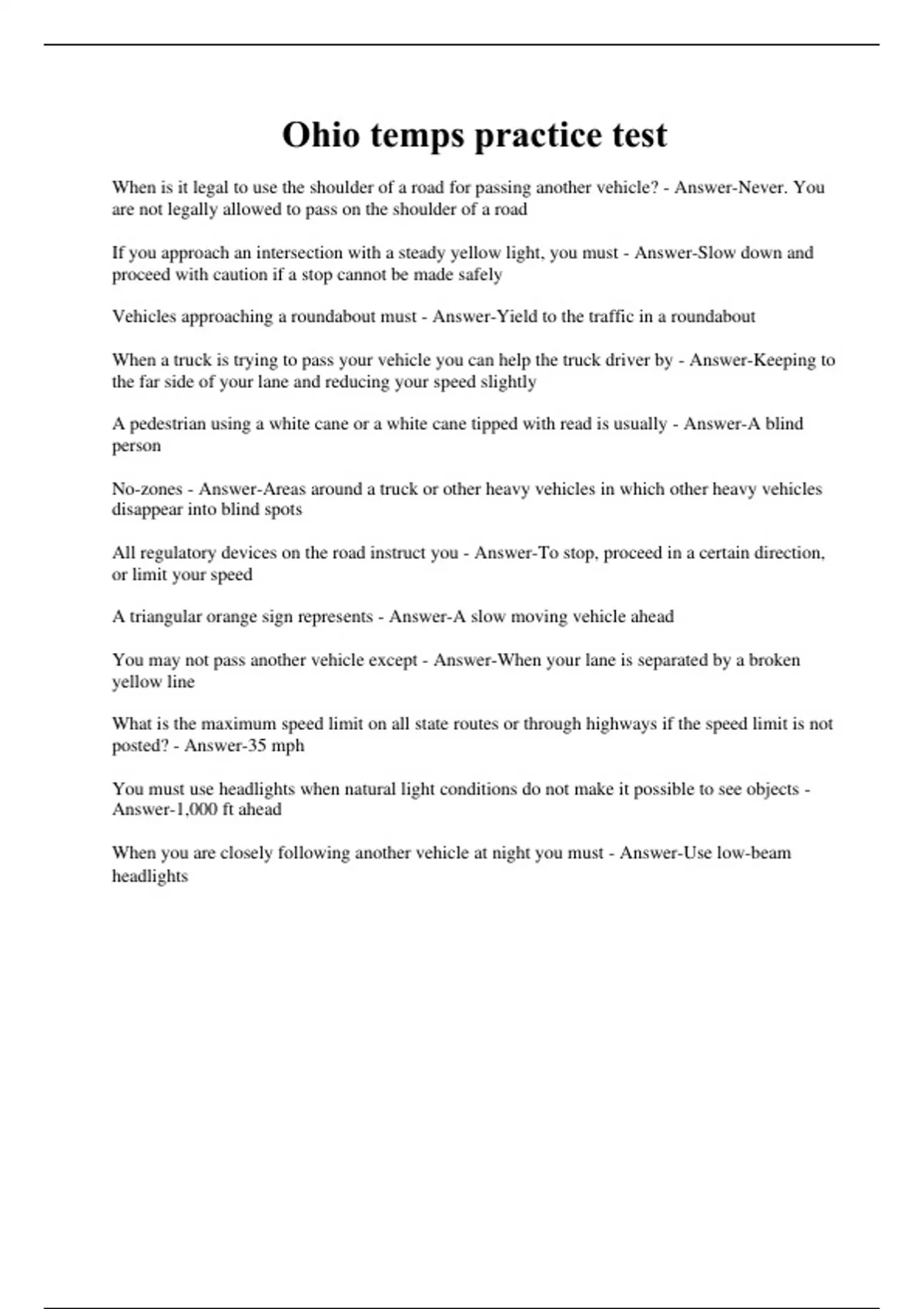When is it legal to use the shoulder of a road for passing another vehicle? - Answer-Never. You are not legally allowed to pass on the shoulder of a road If you approach an intersection with a steady yellow light, you must - Answer-Slow down and proceed with caution if a stop cannot be made safely Vehicles approaching a roundabout must - Answer-Yield to the traffic in a roundabout When a truck is trying to pass your vehicle you can help the truck driver by - Answer-Keeping to the far side of your lane and reducing your speed slightly A pedestrian using a white cane or a white cane tipped with read is usually - Answer-A blind person No-zones - Answer-Areas around a truck or other heavy vehicles in which other heavy vehicles disappear into blind spots All regulatory devices on the road instruct you - Answer-To stop, proceed in a certain direction, or limit your speed A triangular orange sign represents - Answer-A slow moving vehicle ahead You may not pass another vehicle except - Answer-When your lane is separated by a broken yellow line What is the maximum speed limit on all state routes or through highways if the speed limit is not posted? - Answer-35 mph You must use headlights when natural light conditions do not make it possible to see objects - Answer-1,000 ft ahead When you are closely following another vehicle at night you must - Answer-Use low-beam headlights