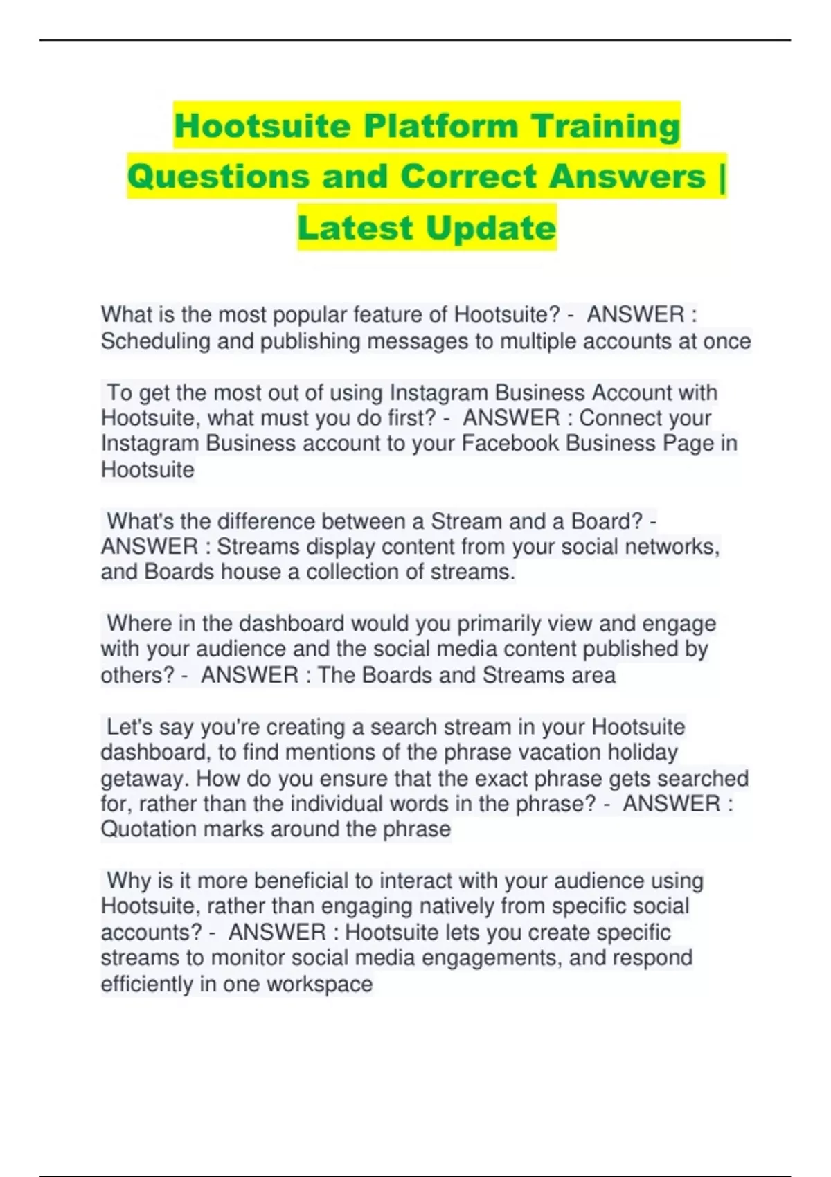 Hootsuite Platform Training Questions and Correct Answers | Latest Update What is the most popular feature of Hootsuite? - ANSWER : Scheduling and publishing messages to multiple accounts at once To get the most out of using Instagram Business Account with Hootsuite, what must you do first? - ANSWER : Connect your Instagram Business account to your Facebook Business Page in Hootsuite What's the difference between a Stream and a Board? - ANSWER : Streams display content from your social networks, and Boards house a collection of streams. Where in the dashboard would you primarily view and engage with your audience and the social media content published by others? - ANSWER : The Boards and Streams area Let's say you're creating a search stream in your Hootsuite dashboard, to find mentions of the phrase vacation holiday getaway. How do you ensure that the exact phrase gets searched for, rather than the individual words in the phrase? - ANSWER : Quotation marks around the phrase Why is it more beneficial to interact with your audience using Hootsuite, rather than engaging natively from specific social accounts? - ANSWER : Hootsuite lets you create specific streams to monitor social media engagements, and respond efficiently in one workspace