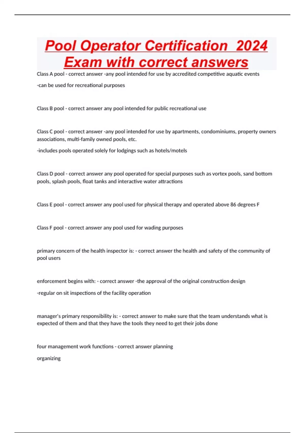 Pool Operator Certification 2024 Exam with correct answers Class A pool - correct answer -any pool intended for use by accredited competitive aquatic events -can be used for recreational purposes Class B pool - correct answer any pool intended for public recreational use Class C pool - correct answer -any pool intended for use by apartments, condominiums, property owners associations, multi-family owned pools, etc. -includes pools operated solely for lodgings such as hotels/motels Class D pool - correct answer any pool operated for special purposes such as vortex pools, sand bottom pools, splash pools, float tanks and interactive water attractions Class E pool - correct answer any pool used for physical therapy and operated above 86 degrees F Class F pool - correct answer any pool used for wading purposes primary concern of the health inspector is: - correct answer the health and safety of the community of pool users enforcement begins with: - correct answer -the approval of the original construction design -regular on sit inspections of the facility operation manager's primary responsibility is: - correct answer to make sure that the team understands what is expected of them and that they have the tools they need to get their jobs done four management work functions - correct answer planning organizing