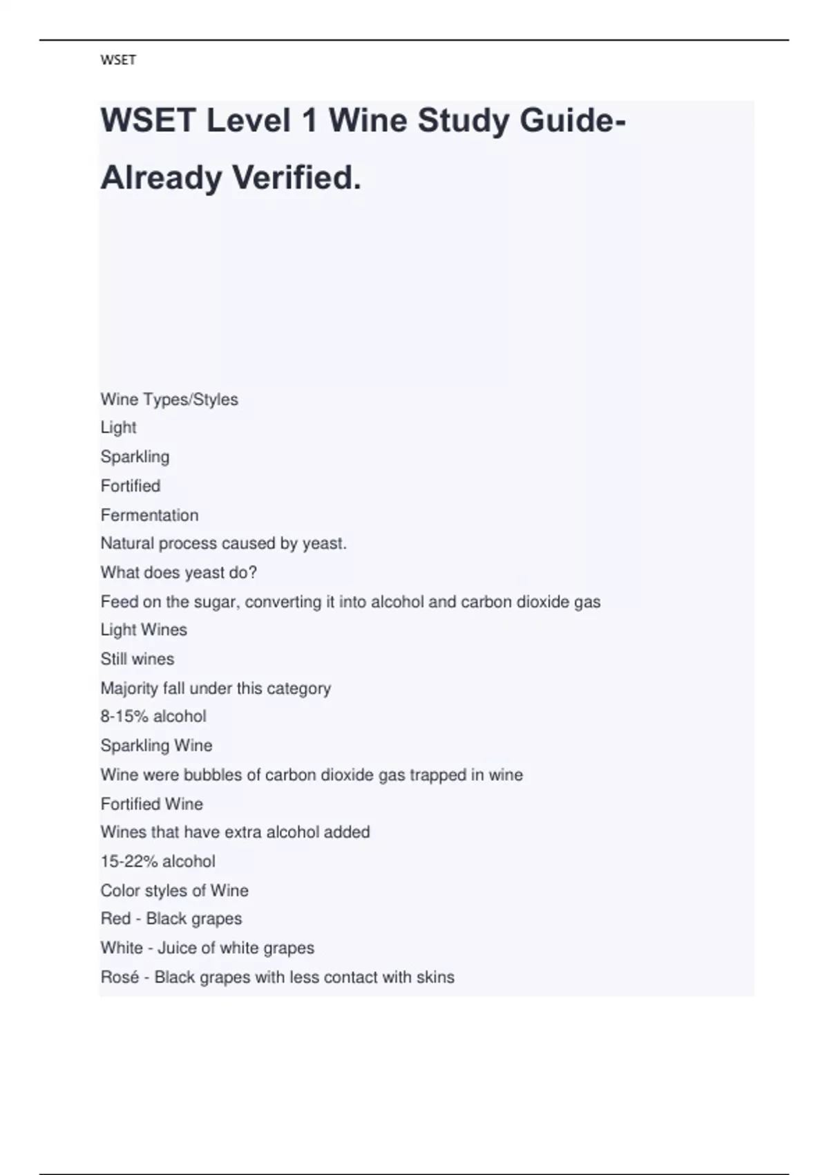 WSET Level 1 Wine Study GuideAlready Verified. Wine Types/Styles Light Sparkling Fortified Fermentation Natural process caused by yeast. What does yeast do? Feed on the sugar, converting it into alcohol and carbon dioxide gas Light Wines Still wines Majority fall under this category 8-15% alcohol Sparkling Wine Wine were bubbles of carbon dioxide gas trapped in wine Fortified Wine Wines that have extra alcohol added 15-22% alcohol Color styles of Wine Red - Black grapes White - Juice of white grapes Rosé - Black grapes with less contact with skins