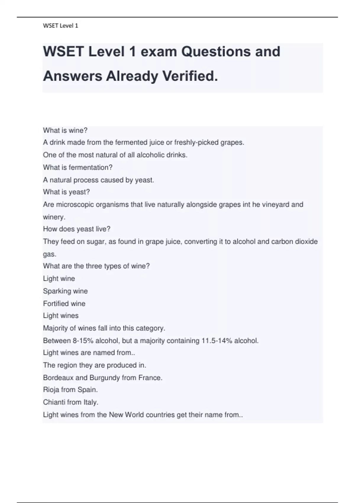WSET Level 1 exam Questions and Answers Already Verified. What is wine? A drink made from the fermented juice or freshly-picked grapes. One of the most natural of all alcoholic drinks. What is fermentation? A natural process caused by yeast. What is yeast? Are microscopic organisms that live naturally alongside grapes int he vineyard and winery. How does yeast live? They feed on sugar, as found in grape juice, converting it to alcohol and carbon dioxide gas. What are the three types of wine? Light wine Sparking wine Fortified wine Light wines Majority of wines fall into this category. Between 8-15% alcohol, but a majority containing 11.5-14% alcohol. Light wines are named from.. The region they are produced in. Bordeaux and Burgundy from France. Rioja from Spain. Chianti from Italy. Light wines from the New World countries get their name from.. WSET Level 1 Labeled with the name of the grape used. Chardonnay or Shiraz from Australia. Sparking wines Bubbles of CO2 gas have been trapped in the wine. Made all over the world. What are examples of sparking wines? Champagne from France. Cava from Spain. Fortified wines