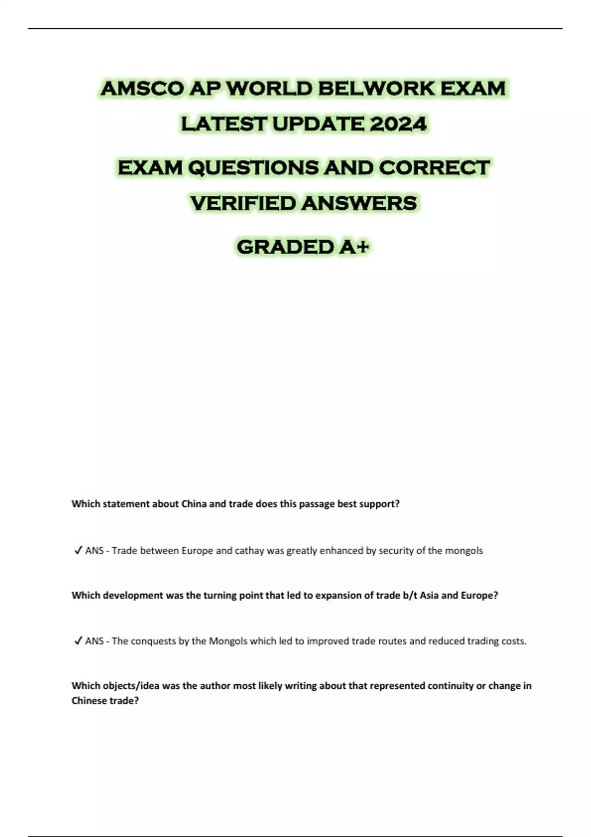 AMSCO AP WORLD BELWORK EXAM LATEST UPDATE 2024 EXAM QUESTIONS AND CORRECT VERIFIED ANSWERS GRADED A+