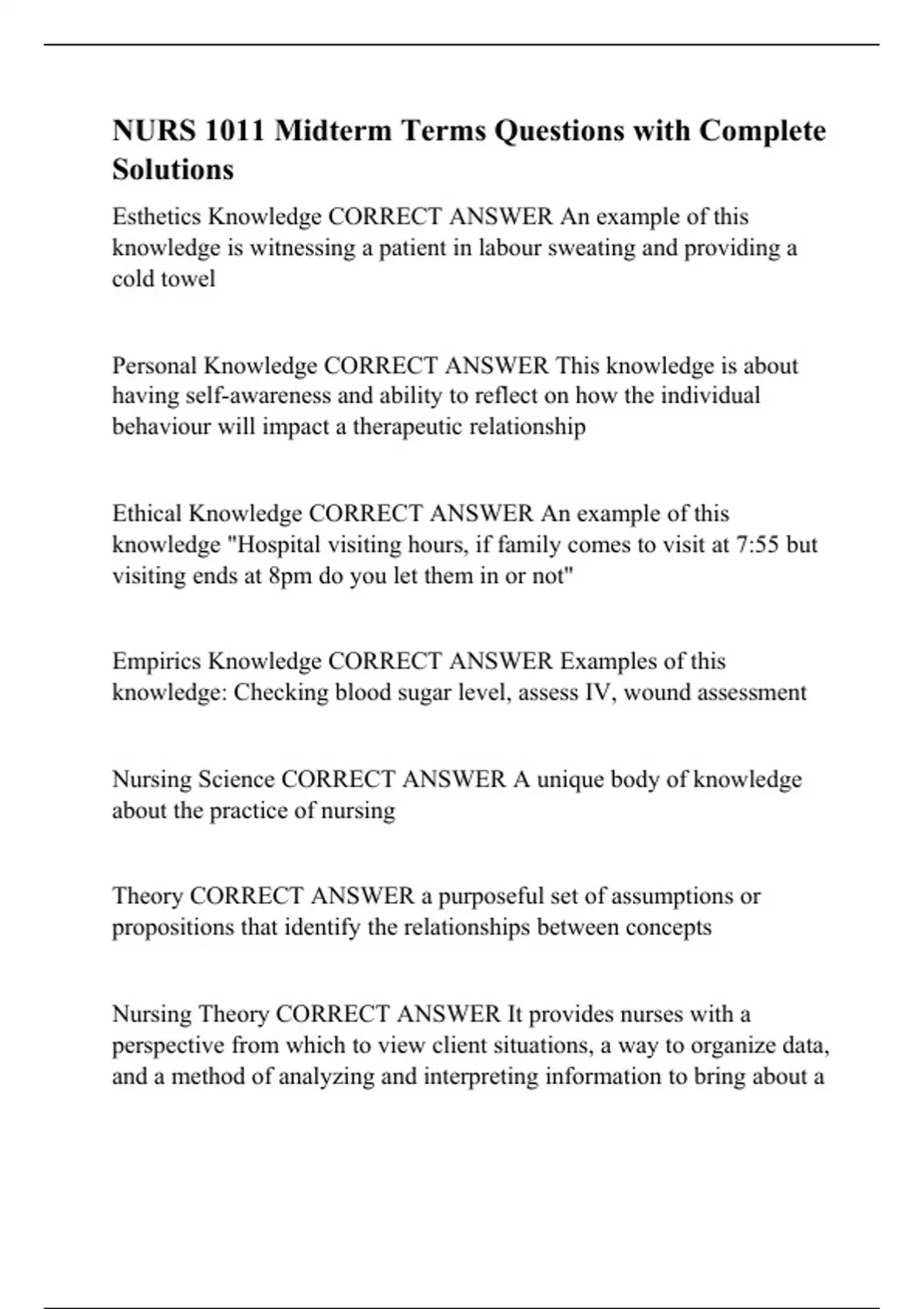 NURS 1011 Midterm Terms Questions with Complete Solutions.