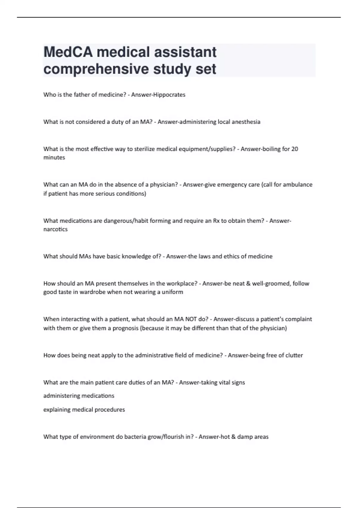 Who is the father of medicine? - Answer-Hippocrates What is not considered a duty of an MA? - Answer-administering local anesthesia What is the most effective way to sterilize medical equipment/supplies? - Answer-boiling for 20 minutes What can an MA do in the absence of a physician? - Answer-give emergency care (call for ambulance if patient has more serious conditions) What medications are dangerous/habit forming and require an Rx to obtain them? - Answernarcotics What should MAs have basic knowledge of? - Answer-the laws and ethics of medicine How should an MA present themselves in the workplace? - Answer-be neat & well-groomed, follow good taste in wardrobe when not wearing a uniform When interacting with a patient, what should an MA NOT do? - Answer-discuss a patient's complaint with them or give them a prognosis (because it may be different than that of the physician) How does being neat apply to the administrative field of medicine? - Answer-being free of clutter What are the main patient care duties of an MA? - Answer-taking vital signs administering medications explaining medical procedures What type of environment do bacteria grow/flourish in? - Answer-hot & damp areasWhat are some of the main duties when caring for bed-ridden patients? - Answer-1) offering pillows for support 2) bed cradle 3) air rings under buttocks What are some of the sites of parenteral medication administration? - Answer-1) intravenous 2) intra-arterial 3) intraosseous infusion (bone marrow) 4) intramuscular 5) intradermal What is called when medication is administered under the skin? - Answer-subcutaneous administration What are analgesics? - Answer-medications used to alleviate pain What is an example of an analgesic? - Answer-morphine What are antibiotics? - Answer-medications used to treat infections caused by bacteria What antibiotics must be refrigerated? - Answer-Amoxicillin and Aureomycin What is an example of an antibiotic? - Answer-penicillin What are antifungals? - Answer-medications used to treat infections caused by fungus (like ringworm) What are anesthetics? - Answer-medications that cause the reversible loss of sensation What is an example of a local anesthetic? - Answer-novocaineWhat are some administrative duties of an MA? - Answer-1) the keeping, filing, and updating of patients' medical records 2) when obtaining medical record info, patients should be discouraged from giving irrelevant info 3) scheduling appointments for patients (based on patient needs) What are the primary methods of filing in a medical office? - Answer-by subject by date (newest first) What is an HMO? - Answer-a health maintenance organization patients pay a fixed amount/periodic fee for medical care from providers who belong to the HMO How do rectal temperatures differ from oral temperatures? - Answer-rectal temperatures are 0.5-1 degree F higher than oral temperatures What is "shaking down"? (mercury thermometer) - Answer-the method of pushing the mercury back into the bulb from the stem; once the thermometer reads 95 degrees F, it's shaken down enough and is available for use again What is the systolic BP? - Answer-when the heart is contracting