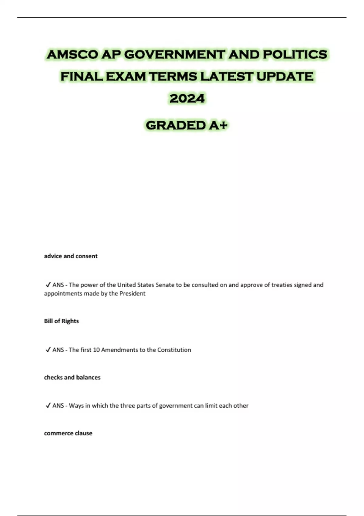 AMSCO AP GOVERNMENT AND POLITICS FINAL EXAM TERMS LATEST UPDATE 2024 GRADED A+