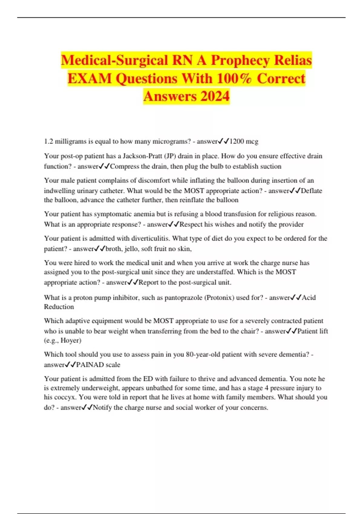 Medical-Surgical RN A Prophecy Relias EXAM Questions With 100% Correct Answers 2024 1.2 milligrams is equal to how many micrograms? - answer1200 mcg Your post-op patient has a Jackson-Pratt (JP) drain in place. How do you ensure effective drain function? - answerCompress the drain, then plug the bulb to establish suction Your male patient complains of discomfort while inflating the balloon during insertion of an indwelling urinary catheter. What would be the MOST appropriate action? - answerDeflate the balloon, advance the catheter further, then reinflate the balloon Your patient has symptomatic anemia but is refusing a blood transfusion for religious reason. What is an appropriate response? - answerRespect his wishes and notify the provider Your patient is admitted with diverticulitis. What type of diet do you expect to be ordered for the patient? - answerbroth, jello, soft fruit no skin, You were hired to work the medical unit and when you arrive at work the charge nurse has assigned you to the post-surgical unit since they are understaffed. Which is the MOST appropriate action? - answerReport to the post-surgical unit. What is a proton pump inhibitor, such as pantoprazole (Protonix) used for? - answerAcid Reduction Which adaptive equipment would be MOST appropriate to use for a severely contracted patient who is unable to bear weight when transferring from the bed to the chair? - answerPatient lift (e.g., Hoyer) Which tool should you use to assess pain in you 80-year-old patient with severe dementia? - answerPAINAD scale Your patient is admitted from the ED with failure to thrive and advanced dementia. You note he is extremely underweight, appears unbathed for some time, and has a stage 4 pressure injury to his coccyx. You were told in report that he lives at home with family members. What should you do? - answerNotify the charge nurse and social worker of your concerns. Your 85-year-old patient with atrial fibrillation fell at home 3 days ago. You notice she has been having several episodes of acute confusion since being admitted to your unit. What is the MOST important order you should anticipate from the provider? - answerStat CT of head Your patient has a temp of 102.3 F, HR 122, and has had 15 mL of urine from the indwelling urinary catheter in the last 2 hours. What is your patient MOST likely experiencing. - answerSepsis What type of personal protective equipment (PPE) is applied prior to entering a room for a patient with C. diff? - answerGown and gloves Your patient continues to pull at their IV site located in their left forearm despite verbal reminders and increased observation. The nursing assistant recommends using soft mitt restraints on the patient. What is your recommendation? - answerRequest an order for soft mitts as they are the least restrictive Your patient was admitted for a hypertensive crisis and has a history of HTN, Parkinson's disease, depression, and alcohol use. On his second hospitalized day, you notice he is more anxious and restless than his baseline. What would be your FIRST nursing intervention? - answerAsk the patient when his last drink of alcohol was. What is the BEST indication of an acute neurological problem? - answerChange in level of consciousness While in a supine position your patient states, "I'm tired and cannot catch my breath." Physical assessment reveals jugular vein distention and a third heart sound (S3). These symptoms are indicative of what condition? - answerHeart failure Your new admission presents with a cough, unintentional weight loss, frequent night sweats, and bloody sputum. What type of isolation precautions should you initiate, if any? - answerAirborne precautions Patients with diabetes are at high risk for complications from damage to what body areas? - answerNerve and kidney damage If your patient with a known history of diabetes is displaying symptoms of diaphoresis, cool skin, lethargy, and shakiness. What is your first action? - answerCheck the patient's blood glucose level. Your patient tells you, "I hope I don't die, but if I do I don't want to be brought back.? You notice on her chart and wrist band that she is a full code. What would be the MOST appropriate action? - answerDiscuss code status with the patient and follow up with provider to ensure the medical record reflects her wishes.