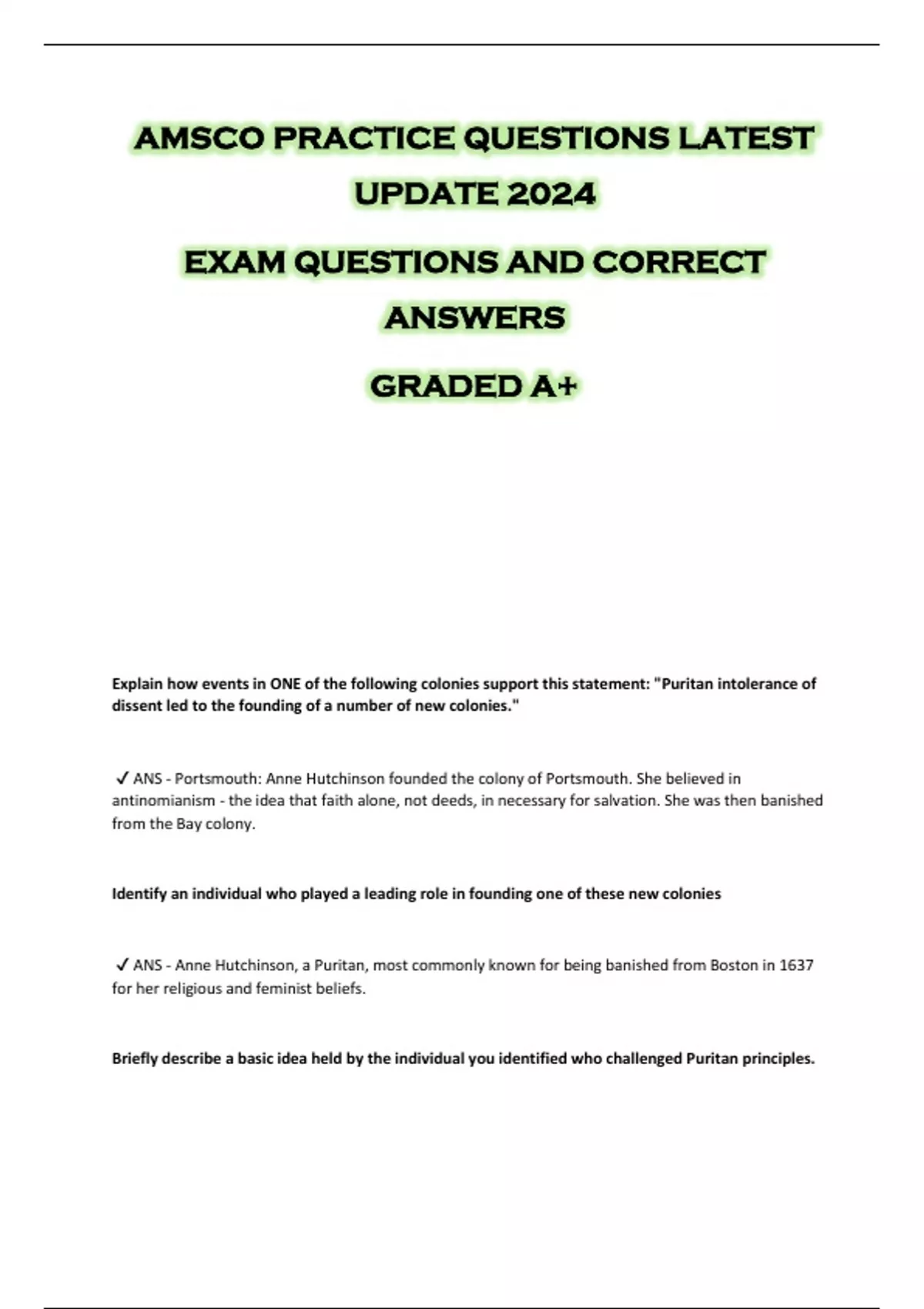 AMSCO PRACTICE QUESTIONS LATEST UPDATE 2024 EXAM QUESTIONS AND CORRECT ANSWERS GRADED A+