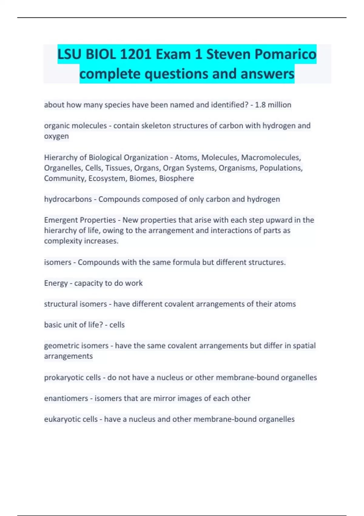 LSU BIOL 1201 Exam 1 Steven Pomarico complete questions and answers