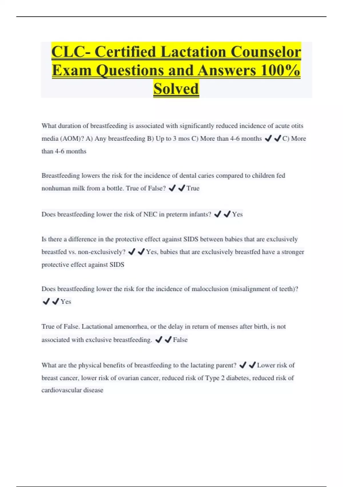 CLC- Certified Lactation Counselor Exam Questions and Answers 100% Solved What duration of breastfeeding is associated with significantly reduced incidence of acute otits media (AOM)? A) Any breastfeeding B) Up to 3 mos C) More than 4-6 months ️️C) More than 4-6 months Breastfeeding lowers the risk for the incidence of dental caries compared to children fed nonhuman milk from a bottle. True of False? ️️True Does breastfeeding lower the risk of NEC in preterm infants? ️️Yes Is there a difference in the protective effect against SIDS between babies that are exclusively breastfed vs. non-exclusively? ️️Yes, babies that are exclusively breastfed have a stronger protective effect against SIDS Does breastfeeding lower the risk for the incidence of malocclusion (misalignment of teeth)? ️️Yes