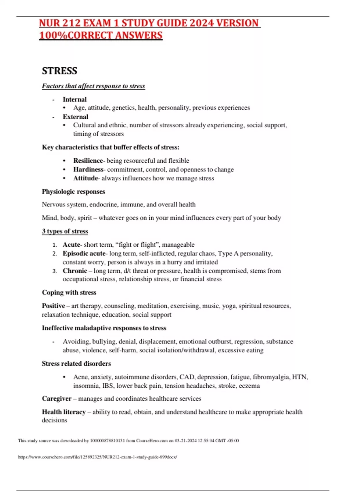 STRESS Factors that affect response to stress - Internal • Age, attitude, genetics, health, personality, previous experiences - External • Cultural and ethnic, number of stressors already experiencing, social support, timing of stressors Key characteristics that buffer effects of stress: • Resilience- being resourceful and flexible • Hardiness- commitment, control, and openness to change • Attitude- always influences how we manage stress Physiologic responses Nervous system, endocrine, immune, and overall health Mind, body, spirit – whatever goes on in your mind influences every part of your body 3 types of stress 1. Acute- short term, “fight or flight”, manageable 2. Episodic acute- long term, self-inflicted, regular chaos, Type A personality, constant worry, person is always in a hurry and irritated 3. Chronic – long term, d/t threat or pressure, health is compromised, stems from occupational stress, relationship stress, or financial stress Coping with stress Positive – art therapy, counseling, meditation, exercising, music, yoga, spiritual resources, relaxation technique, education, social support Ineffective maladaptive resp