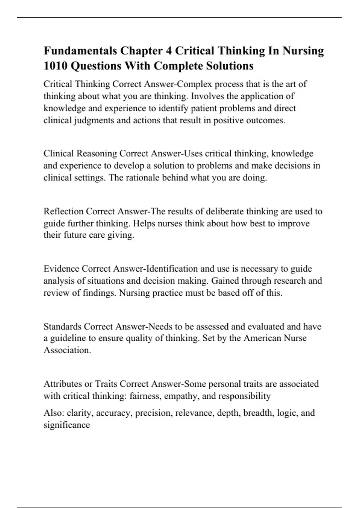 Fundamentals Chapter 4 Critical Thinking In Nursing 1010 Questions With Complete Solutions