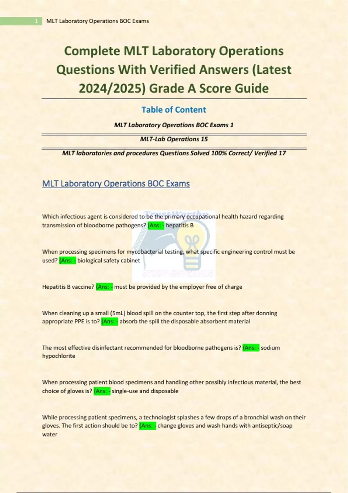 Complete MLT Laboratory Operations Questions With Verified Answers (Latest 2024/2025) Grade A Score Guide Table of Content MLT Laboratory Operations BOC Exams 1 MLT-Lab Operations 15 MLT laboratories and procedures Questions Solved 100% Correct/ Verified 17