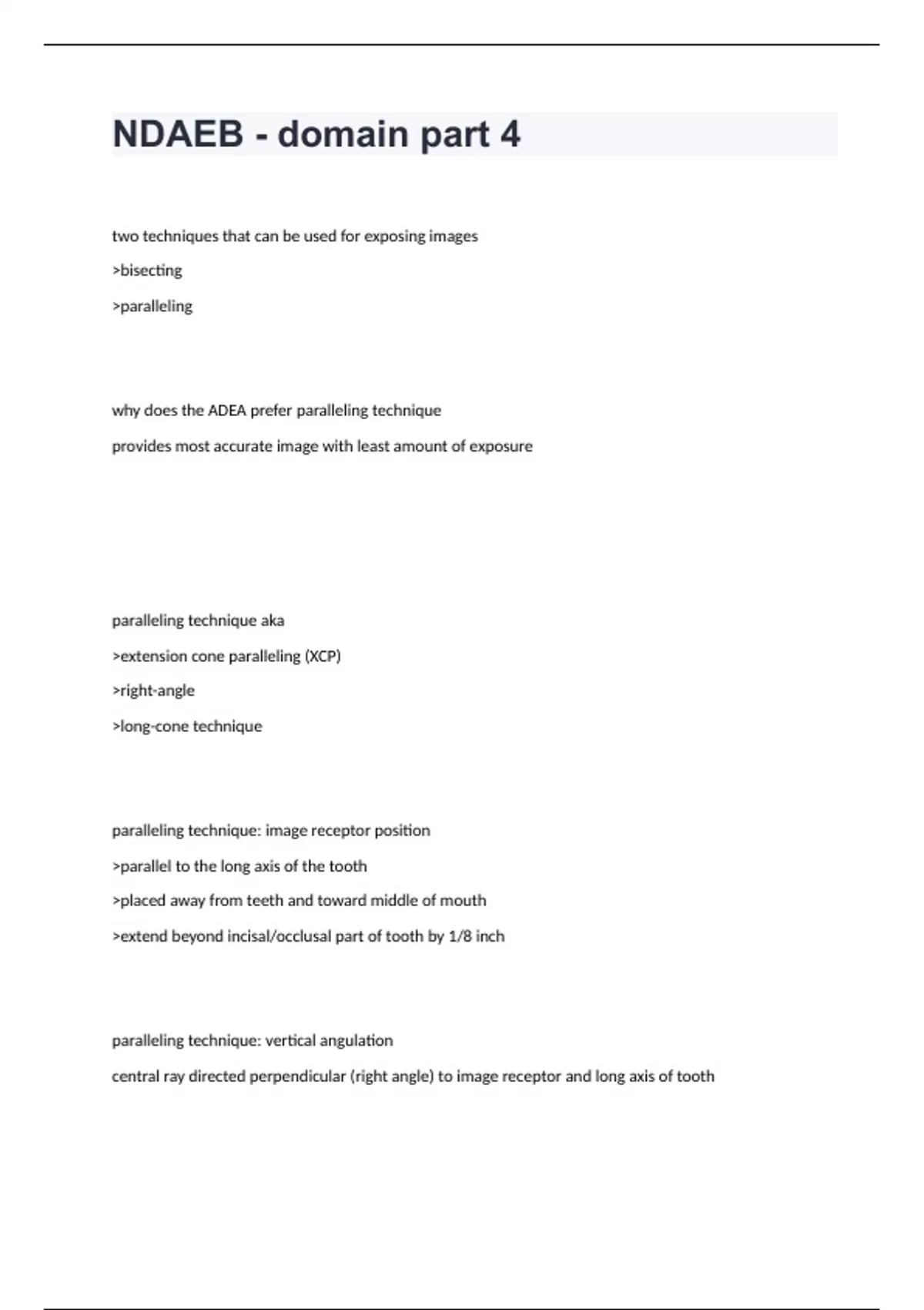 NDAEB - domain part 4 verified already passed 2024/2025two techniques that can be used for exposing images >bisecting >paralleling why does the ADEA prefer paralleling technique provides most accurate image with least amount of exposure paralleling technique aka >extension cone paralleling (XCP) >right-angle >long-cone technique paralleling technique: image receptor position >parallel to the long axis of the tooth >placed away from teeth and toward middle of mouth >extend beyond incisal/occlusal part of tooth by 1/8 inch paralleling technique: vertical angulation central ray directed perpendicular (right angle) to image receptor and long axis of tooth paralleling technique: horizontal angulation central ray directed through contact areas when exposing periapical views with paralleling technique, which teeth should you start with and why anterior, uses smaller image receptor meaning patients will be able to tolerate better bisecting technique places the film _________ __________ the teeth to be exposed directly against bisecting technique: angulation and placement >angle formed by long axis of tooth and image receptor is bisected into 2 equal parts >x-ray beam directed perpendicular to bisecting line horizontal angulation ______ ____ ______ whether you are using paralleling/bisecting remains the same incorrect vertical angulation results in >image that is not the same length as the tooth >appears shorter/longer foreshortened images result from excessive vertical angulation elongated images result from insufficient vertical angulation patient's midsaggital plane should be __________ to the floor perpendicular what type of film or sensor holders can be used in the bisecting technique >BAI >stabe >EeZee grip (snap-a-ray) in the bisecting technique, how is the film or sensor placed in relation to the teeth directly against teeth occlusal film sizes for adult and children 4, 2 what changed must be made in exposure factors when one is exposing dental images on a pediatric patient >milliamperage >kilovoltage