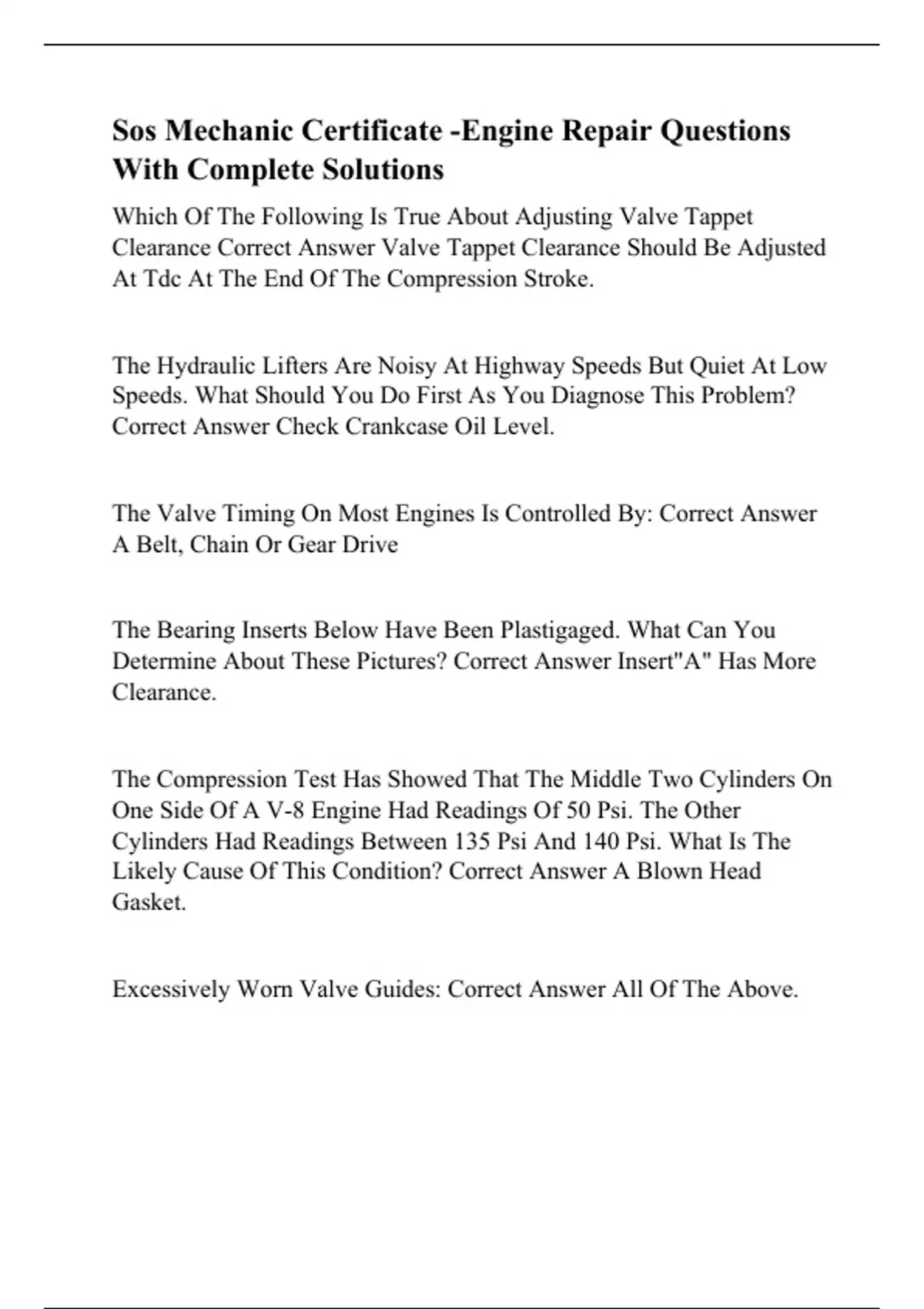 Sos Mechanic Certificate -Engine Repair Questions With Complete Solutions