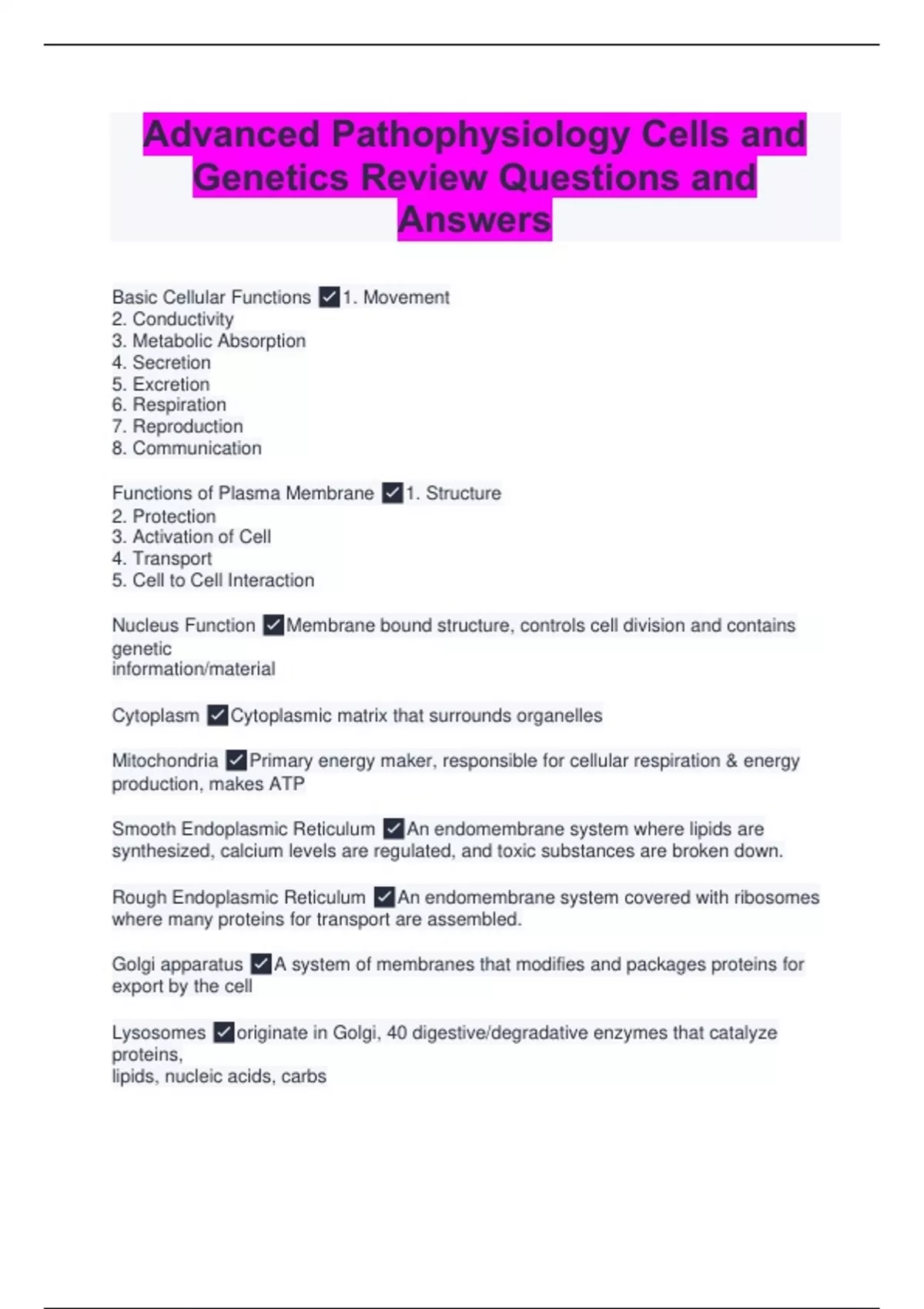 Basic Cellular Functions 1. Movement 2. Conductivity 3. Metabolic Absorption 4. Secretion 5. Excretion 6. Respiration 7. Reproduction 8. Communication Functions of Plasma Membrane 1. Structure 2. Protection 3. Activation of Cell 4. Transport 5. Cell to Cell Interaction Nucleus Function Membrane bound structure, controls cell division and contains genetic information/material Cytoplasm Cytoplasmic matrix that surrounds organelles Mitochondria Primary energy maker, responsible for cellular respiration & energy production, makes ATP Smooth Endoplasmic Reticulum An endomembrane system where lipids are synthesized, calcium levels are regulated, and toxic substances are broken down. Rough Endoplasmic Reticulum An endomembrane system covered with ribosomes where many proteins for transport are assembled. Golgi apparatus A system of membranes that modifies and packages proteins for export by the cell Lysosomes originate in Golgi, 40 digestive/degradative enzymes that catalyze proteins, lipids, nucleic acids, carbs