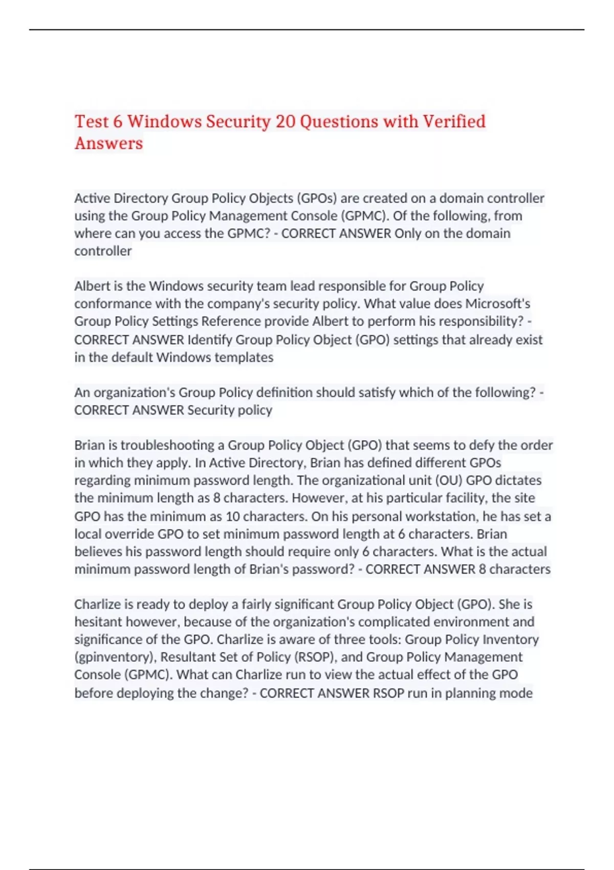 Test 6 Windows Security 20 Questions with Verified Answers Active Directory Group Policy Objects (GPOs) are created on a domain controller using the Group Policy Management Console (GPMC). Of the following, from where can you access the GPMC? - CORRECT ANSWER Only on the domain controller Albert is the Windows security team lead responsible for Group Policy conformance with the company's security policy. What value does Microsoft's Group Policy Settings Reference provide Albert to perform his responsibility? - CORRECT ANSWER Identify Group Policy Object (GPO) settings that already exist in the default Windows templates An organization's Group Policy definition should satisfy which of the following? - CORRECT ANSWER Security policy Brian is troubleshooting a Group Policy Object (GPO) that seems to defy the order in which they apply. In Active Directory, Brian has defined different GPOs regarding minimum password length. The organizational unit (OU) GPO dictates the minimum length as 8 characters. However, at his particular facility, the site GPO has the minimum as 10 characters. On his personal workstation, he has set a local override GPO to set minimum password length at 6 characters. Brian believes his password length should require only 6 characters. What is the actual minimum password length of Brian's password? - CORRECT ANSWER 8 characters Charlize is ready to deploy a fairly significant Group Policy Object (GPO). She is hesitant however, because of the organization's complicated environment and significance of the GPO. Charlize is aware of three tools: Group Policy Inventory (gpinventory), Resultant Set of Policy (RSOP), and Group Policy Management Console (GPMC). What can Charlize run to view the actual effect of the GPO before deploying the change? - CORRECT ANSWER RSOP run in planning mode For Group Policy settings stored in the Windows Registry, which of the following should be used to modify the Group Policy Object (GPO) data? - CORRECT ANSWER Use the Local Group Policy Editor Registry Editor. Use the Registry Editor only as a last resort. For a Group Policy Object (GPO) to become active, it must be linked to at least one computer, domain, or which of the following? - CORRECT ANSWER Organizational unit (OU) Maria, a Windows administrator, has a new Group Policy to apply to computers in her organization. Using Windows Server 2012, she will use Group Policy Object (GPO) caching. Given Maria's decision, what group of computers will last apply the GPO? - CORRECT ANSWER Computers offline, at a regular interval after start time Microsoft provides two main tools to be used when auditing Group Policy. Which of the following tools must be downloaded because it is not included in Windows by default? - CORRECT ANSWER Group Policy Inventory tool Of the following, which can be defined in Active Directory? - CORRECT ANSWER Both Local Group Policy settings and Group Policies There are a wide variety of resources available for best practices use when designing and implementing Group Policy across a domain. Of the following, which resource helps identify Group Policy configuration errors or dependency issues that may prevent settings from functioning as expected? - CORRECT ANSWER Group Policy Best Practices Analyzer Yasmin, a Windows administrator, has a new Group Policy to apply to laptops in her organization. By default, Windows checks for new or updated Group Policy Objects (GPOs) at a random interval between 90 to 120 minutes. Using Windows Server 2012, she will use Remote Group Policy Update. Given Yasmin's actions, when will the online laptops receive the GPO? - CORRECT ANSWER Online laptops will apply the GPO within 10 minutes. Windows applies multiple Group Policy Objects (GPOs) in a specific order, lower to higher. Of the following, which is the highest GPO in the order? - CORRECT ANSWER Organizational unit GPOs Windows applies Group Policy Objects (GPOs) to all computers and users in an organizational unit (OU) container by default. Which tool can be used to change that behavior? - CORRECT ANSWER Security filters Which of the following is true? - CORRECT ANSWER Group Policy Settings apply many settings to the current session. Which of the following is true about defining and linking the number of GPOs to satisfy an organization's security policy? - CORRECT ANSWER Define and link the minimum number of GPOs to satisfy the security policy. Which of the following is a Windows Server feature that forces Group Policy updates on all selected computers? - CORRECT ANSWER Remote Group Policy Update Which of the following entities is most directly responsible to ensure the security of an organization's assets? - CORRECT ANSWER Management Where does Windows store Active Directory Group Policy Objects (GPOs)? - CORRECT ANSWER On the domain controller in the Policies folder When you first open the Local Group Policy Editor, you see Computer Configuration and which of the following? - CORRECT ANSWER User Configuration