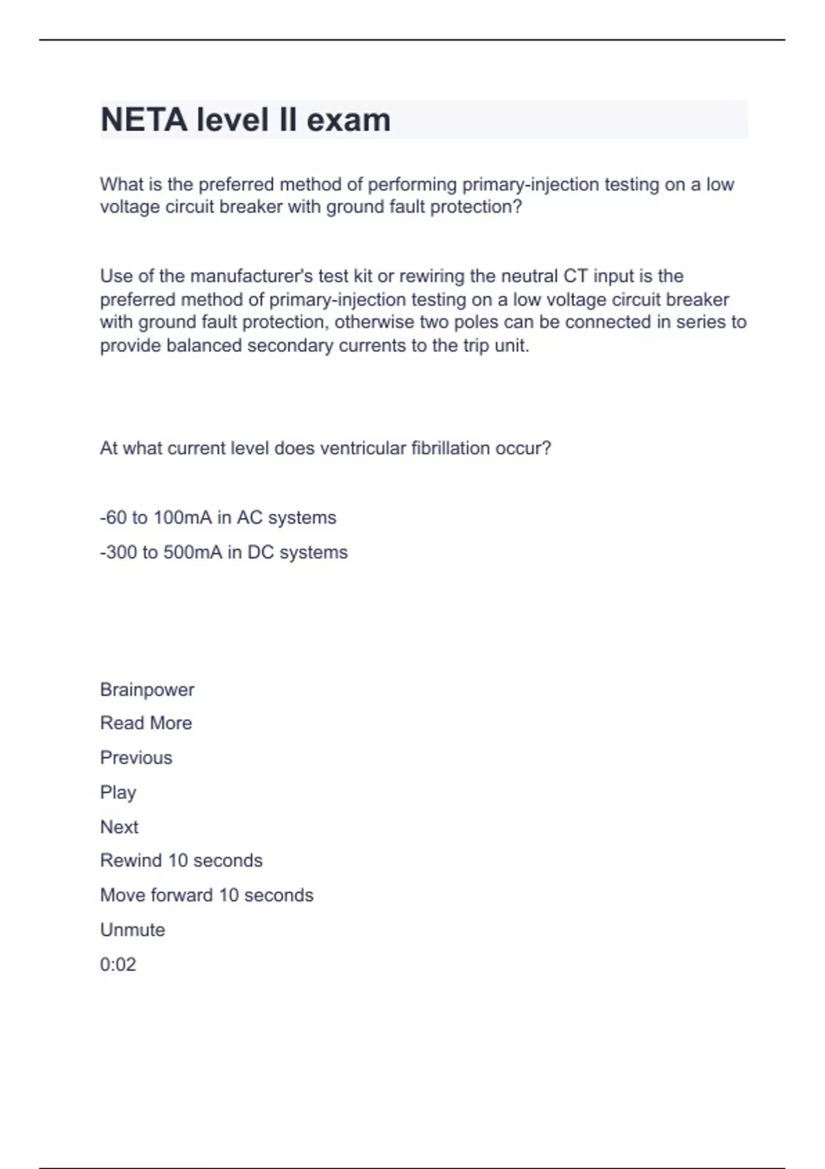 NETA level II exam Questions with complete solution 2024 What is the preferred method of performing primary-injection testing on a low voltage circuit breaker with ground fault protection? Use of the manufacturer's test kit or rewiring the neutral CT input is the preferred method of primary-injection testing on a low voltage circuit breaker with ground fault protection, otherwise two poles can be connected in series to provide balanced secondary currents to the trip unit. At what current level does ventricular fibrillation occur? -60 to 100mA in AC systems -300 to 500mA in DC systems