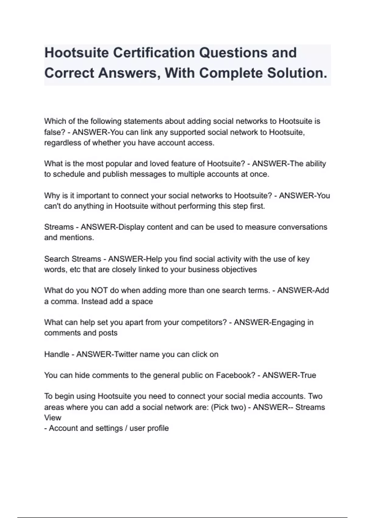Hootsuite Certification Questions and Correct Answers, With Complete Solution.