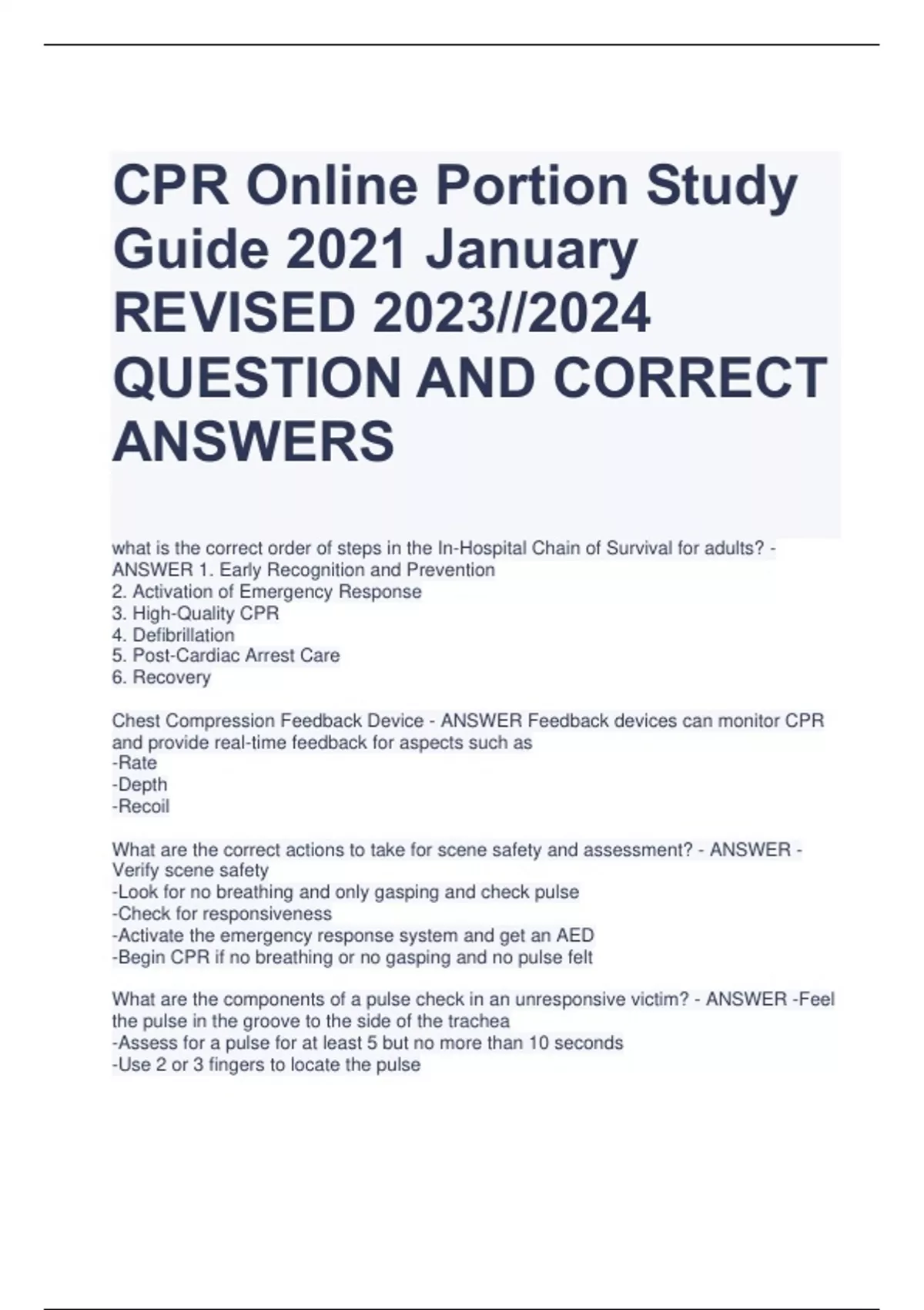 CPR Online Portion Study Guide 2021 January REVISED 2023//2024 QUESTION AND CORRECT ANSWERS