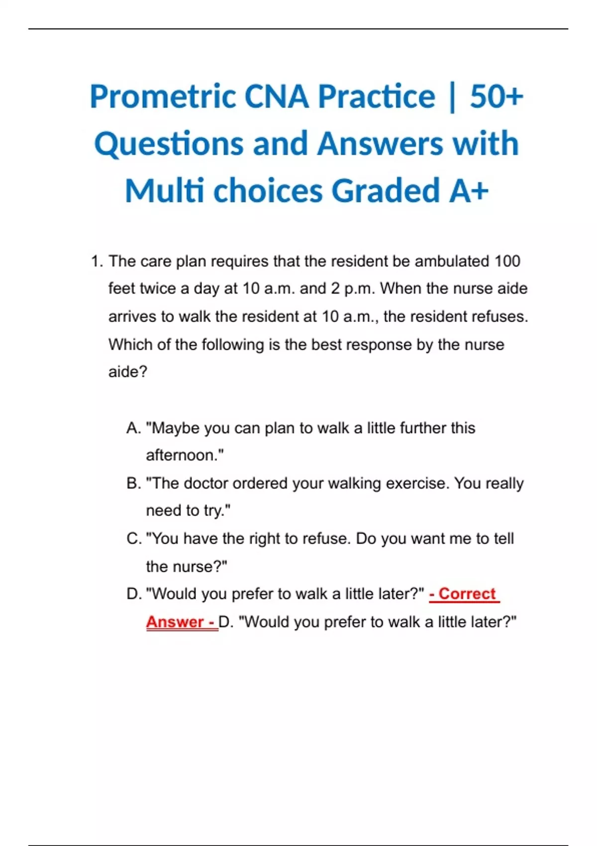 Prometric CNA Practice | 50+ Questions and Answers with Multi choices Graded A+ Prometric CNA Practice | 50+ Questions and Answers with Multi choices Graded A+ Prometric CNA Practice | 50+ Questions and Answers with Multi choices Graded A+